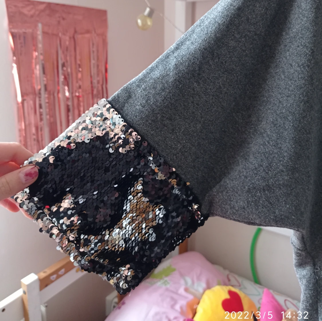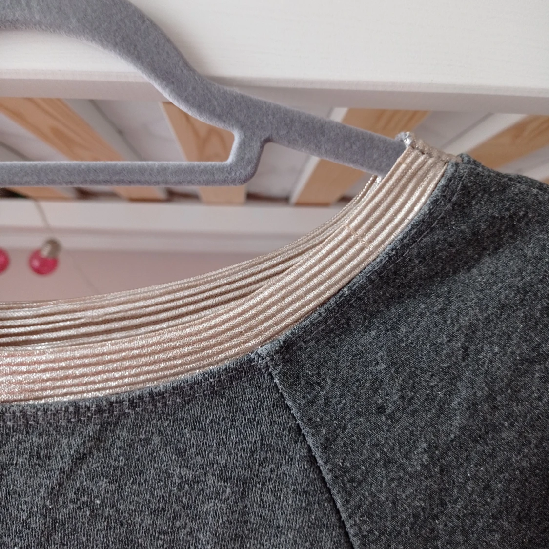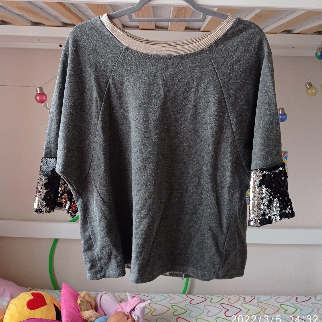 En kortärmad grå tröja, med glitter på änden av ärrmen och en silver Kant på änden av halsen.( Kontakta mig för frakt pris).