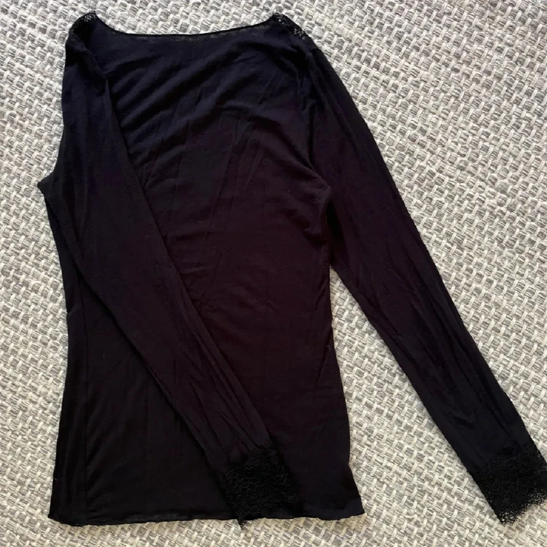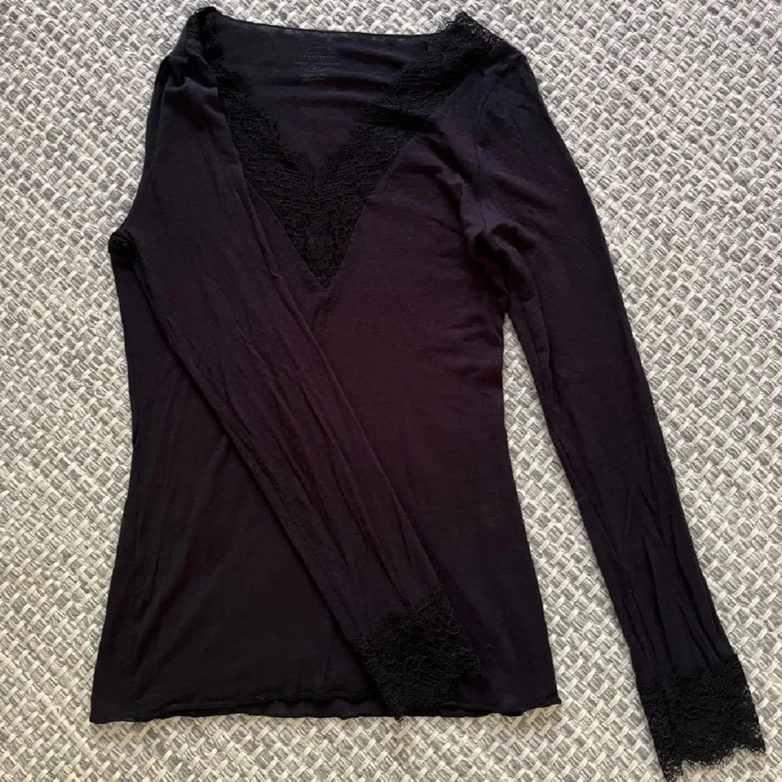Supersnygg svart långarmad topp från Intimissmi med v-ringning och spetsdetaljer vid halsringning och ärmslut. Tunn och mjuk kvalitet i bomull och kashmir, perfekt för lager-på-lager eller som statement-piece. Sitter tight och har en elegant vibe. Bara ett litet hål i nedre delen av armen inget som syns❤️