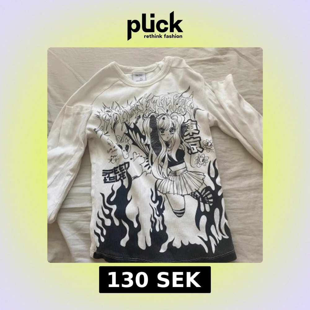 Säljer en vit långärmad tröja med svart anime-inspirerat tryck framtill. Motivet föreställer en tecknad tjej med stora ögon, långa tofsar och kjol, omgiven av eldliknande mönster och japansk text. Perfekt för dig som gillar unik streetstyle!
