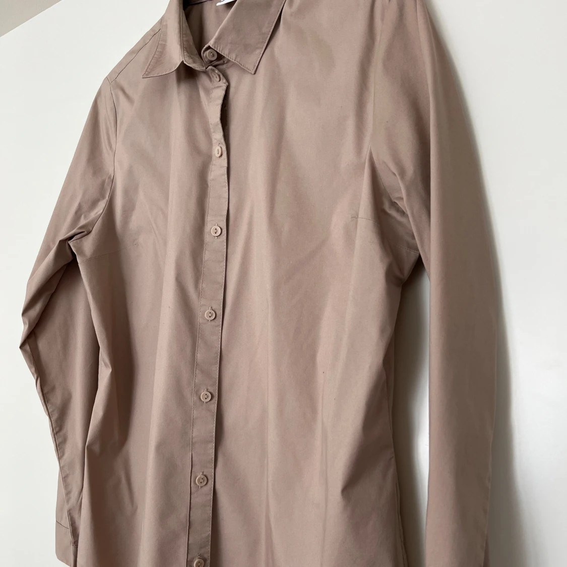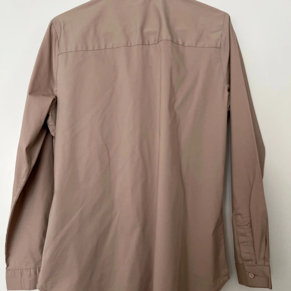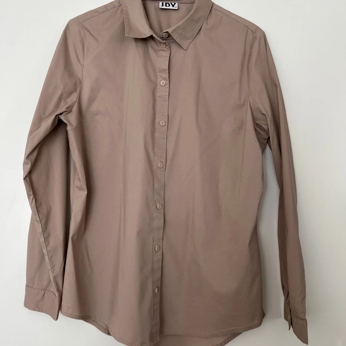 Ljusbrun skjorta med långa ärmar och knäppning framtill, från JDY i storlek 40. Klassisk krage och rak passform. Skjortan är i nyskick. 72% bomull, 24% polyester och 4% elastan. Mått: Längd ca 75 cm Byst ca 50 cm Midja ca 50 cm Ärmlängd mätt från axeln ca 60 cm Axelmått 40 cm