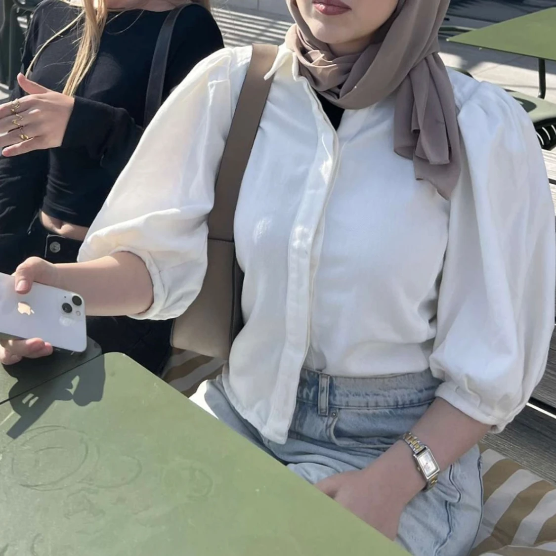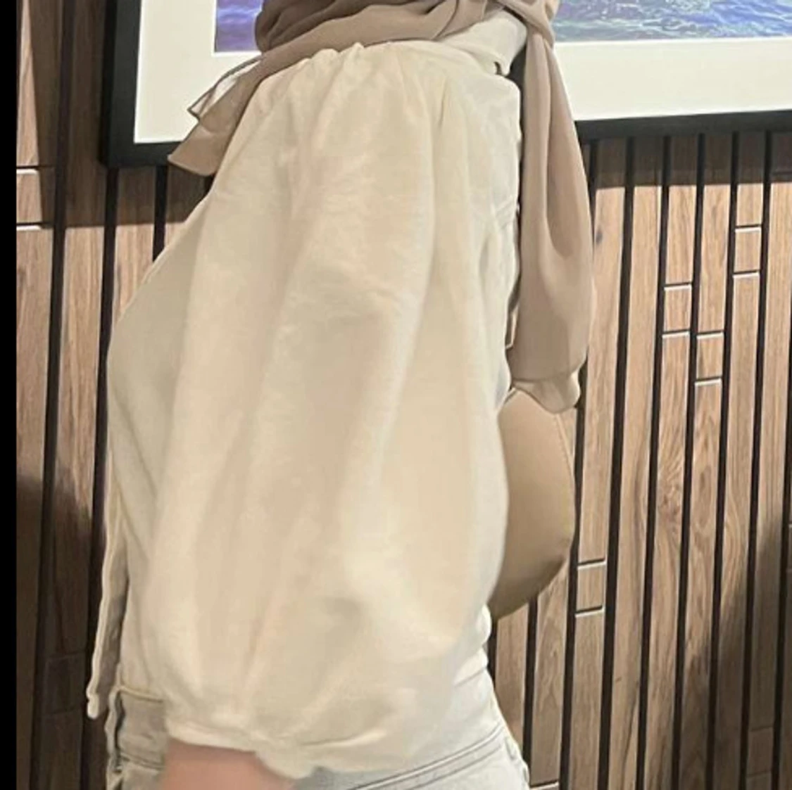 Säljer en vit denim skjorta med puffiga trekvartsärmar och klassisk krage. Skjortan har knappar framtill och är tillverkad i ett mjukt bomullstyg. Perfekt att styla med jeans för en clean och trendig look. Har använt en gång