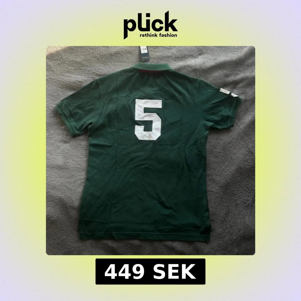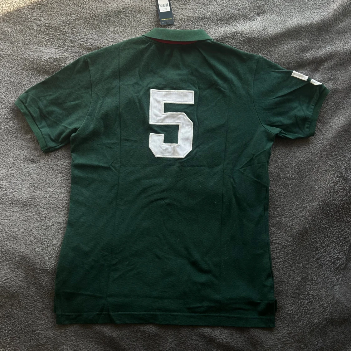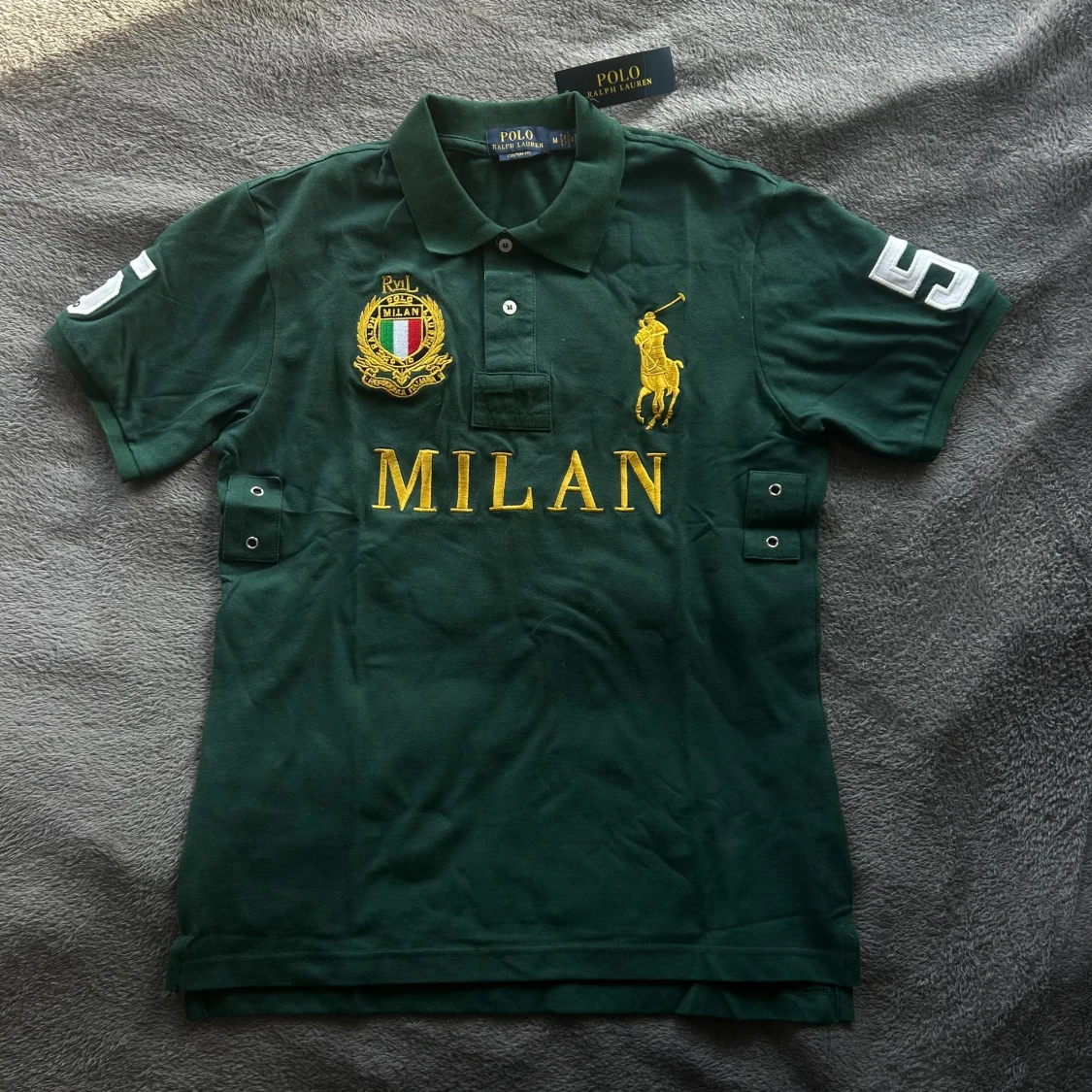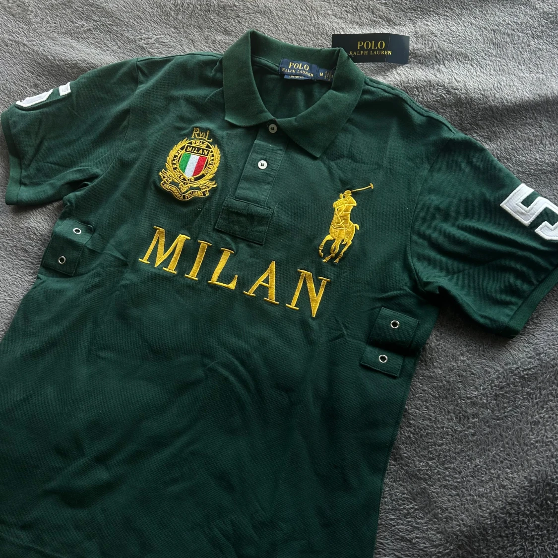 Snygg grön pikétröja från Polo Ralph Lauren med stora gula broderier, MILAN-text och emblem på bröstet. Klassisk krage, korta ärmar och vita siffror på ryggen och ena ärmen. Materialet är mjuk bomull och passformen är normal.