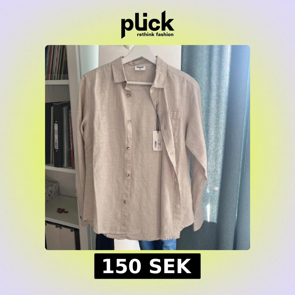 Snygg beige skjorta från Kappahl i storlek 152. Skjortan är tillverkad i linne, har klassisk krage, långa ärmar och knäppning framtill. Perfekt för en clean och stilren look. En bröstficka ger extra detalj. Helt ny