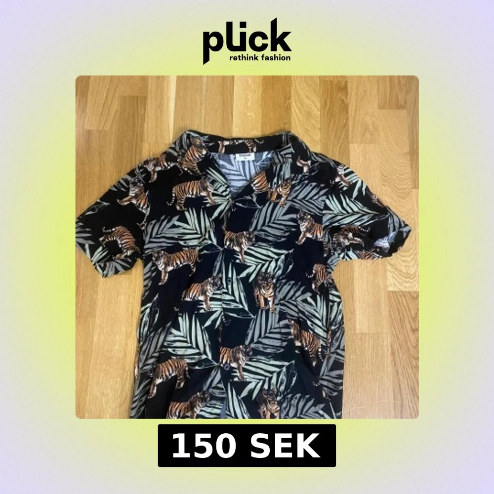 Cool svart skjorta från Kappahl med korta ärmar och knappar framtill. Skjortan har ett tropiskt mönster med tigrar och gröna blad som ger en riktigt unik vibe. Perfekt för dig som vill sticka ut med ett djuriskt print.