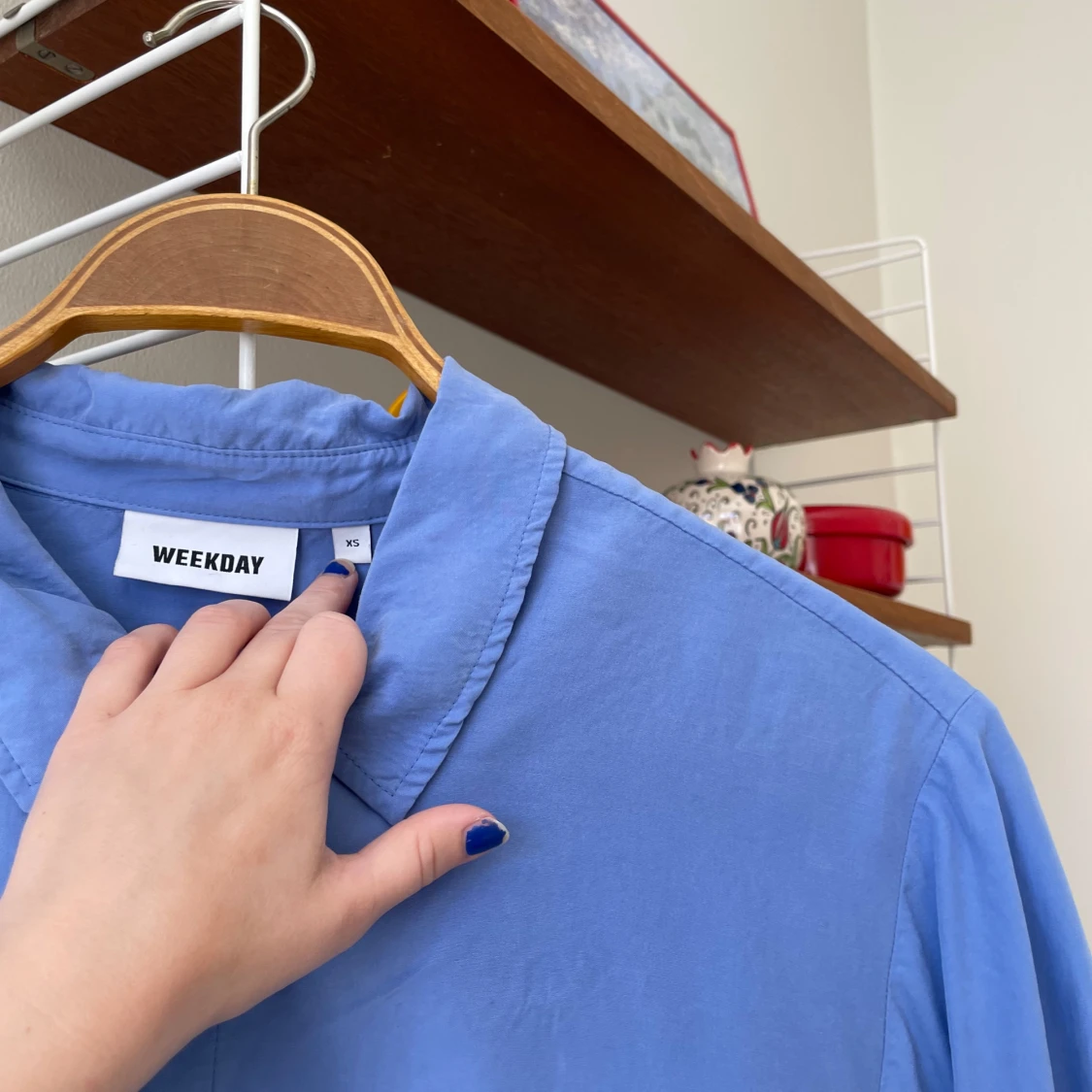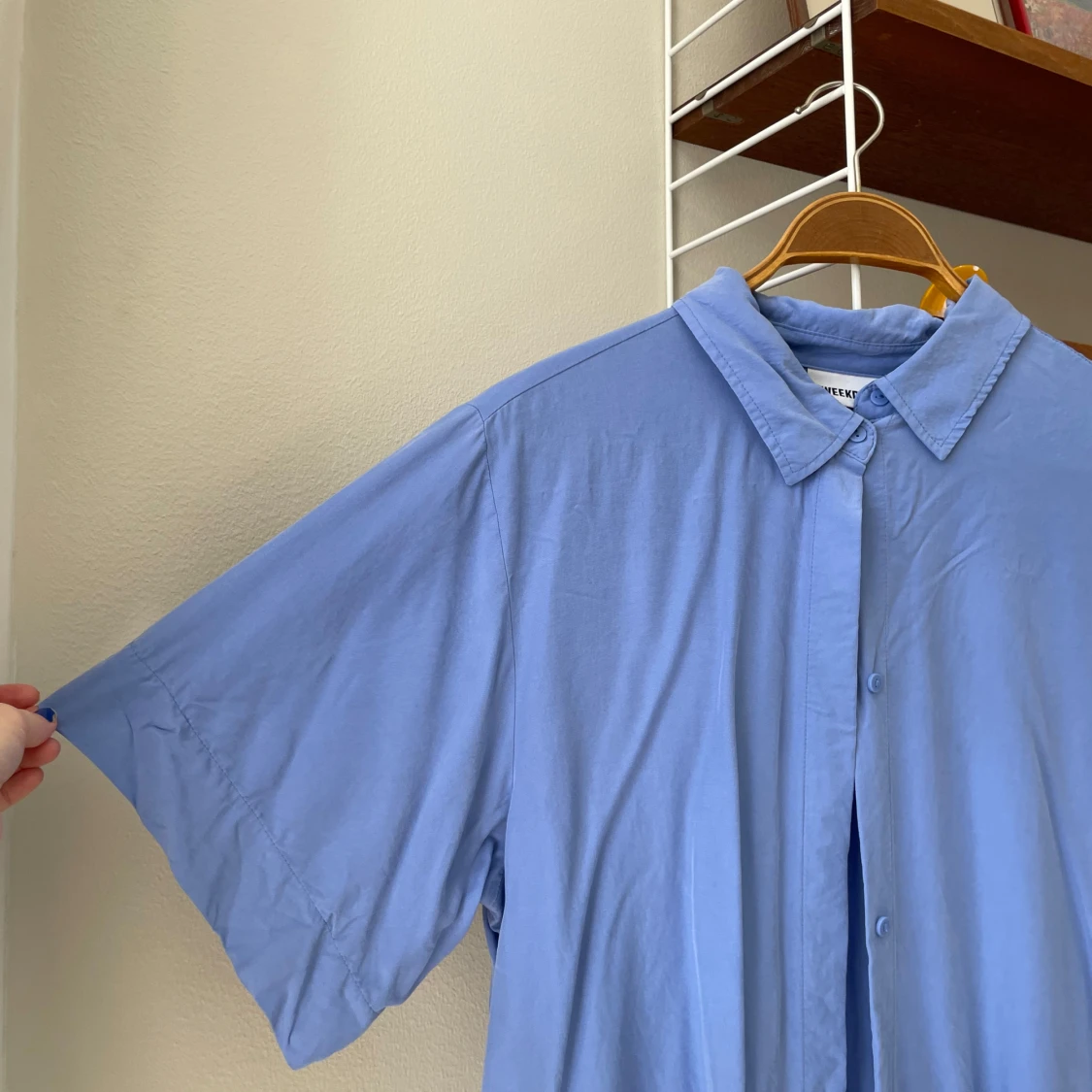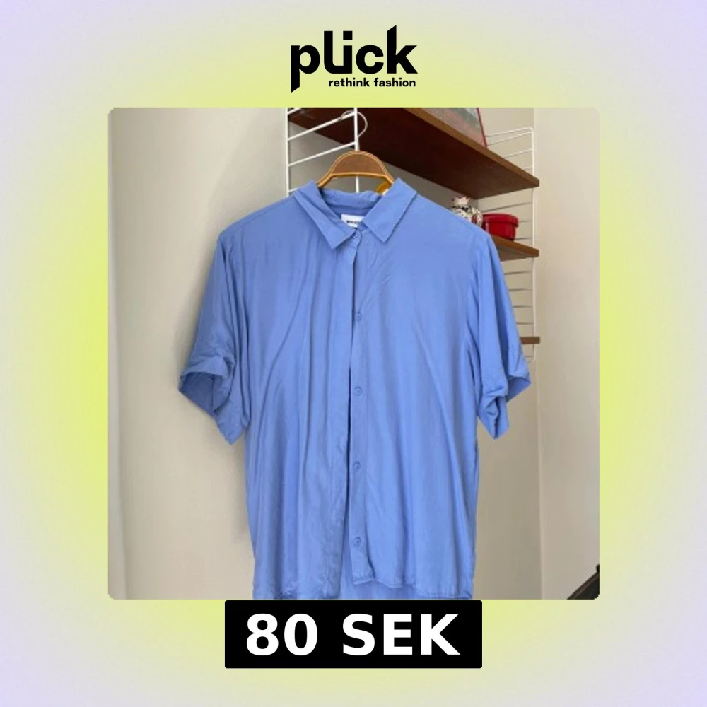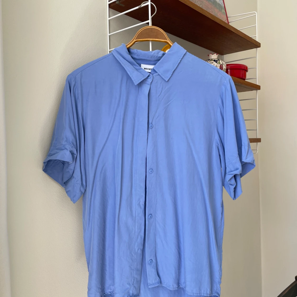 Skjorta från Weekday i vacker blå färg med lyster. 100 % modal. Strl 34. Fint skick!