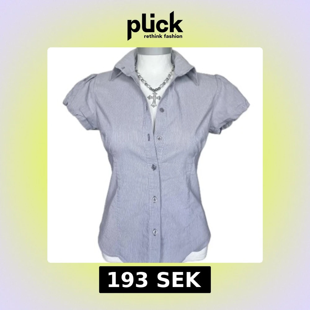Snygg vit och grå skjorta med ränder och puffiga korta ärmar. Krage och knappar. Perfekt till jeans eller kjol! Storlek 40, kan även passa 38 🌸