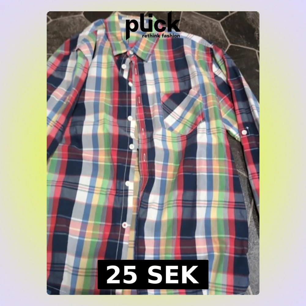 Säljer en färgglad rutig skjorta med lång ärm och klassisk krage. Skjortan har knappar framtill och en bröstficka. Färgerna är blå, röd, grön, gul och vit. Perfekt för dig som vill sticka ut lite extra!