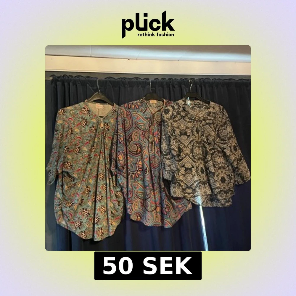 Tre henley-skjortor med unika mönster: en blågrön med blommor och paisley, en färgstark paisley i blått, rött och gult, samt en svartvit skjorta med detaljerat paisley-mönster. Alla har knappar vid halsen och lång ärm. Perfekt för dig som gillar boho-vibe och coola prints.