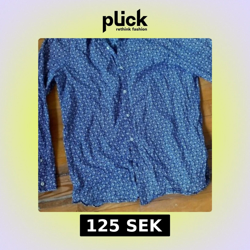 Blå mönstrad skjorta från Denim Day stl L - Snygg blå skjorta från Denim Day med vitt paisleymönster och klassisk krage. Skjortan har långa ärmar och knäppning framtill. Perfekt för dig som gillar en avslappnad men ändå stilren look.
