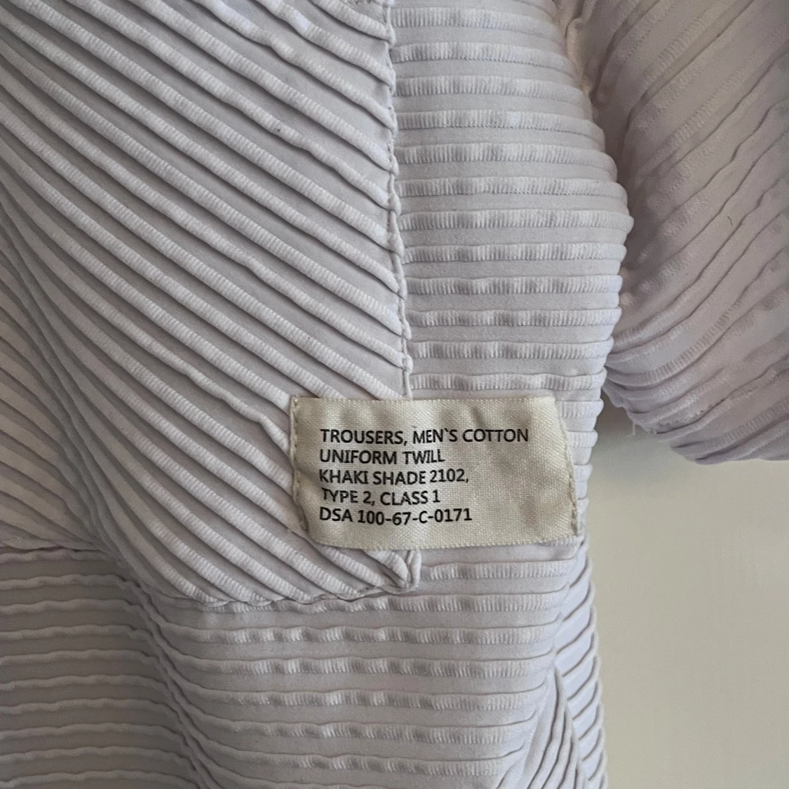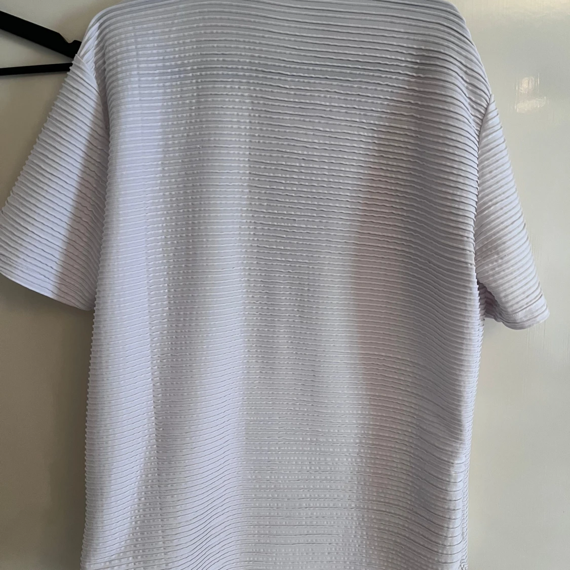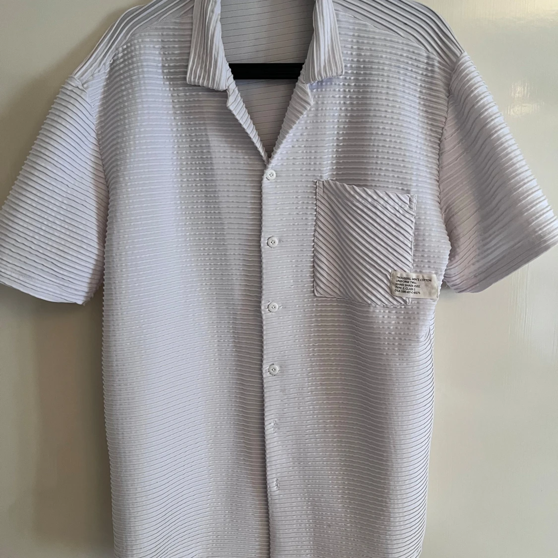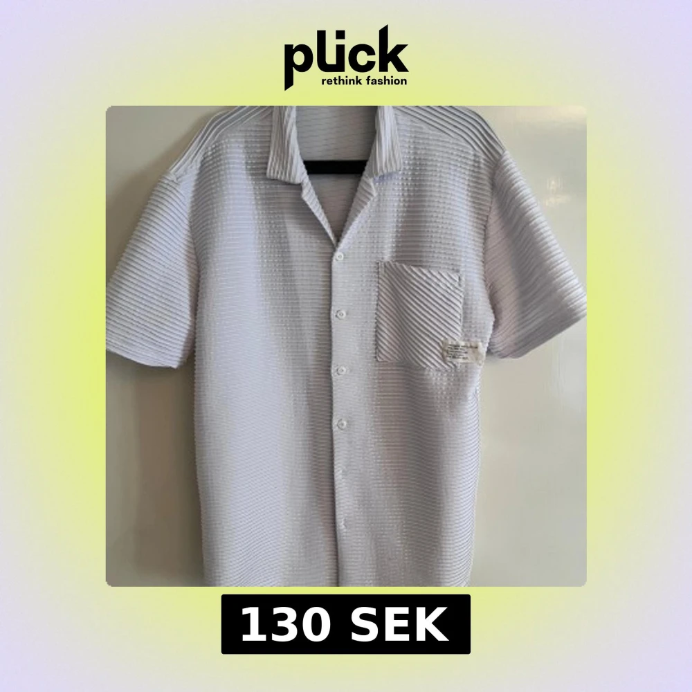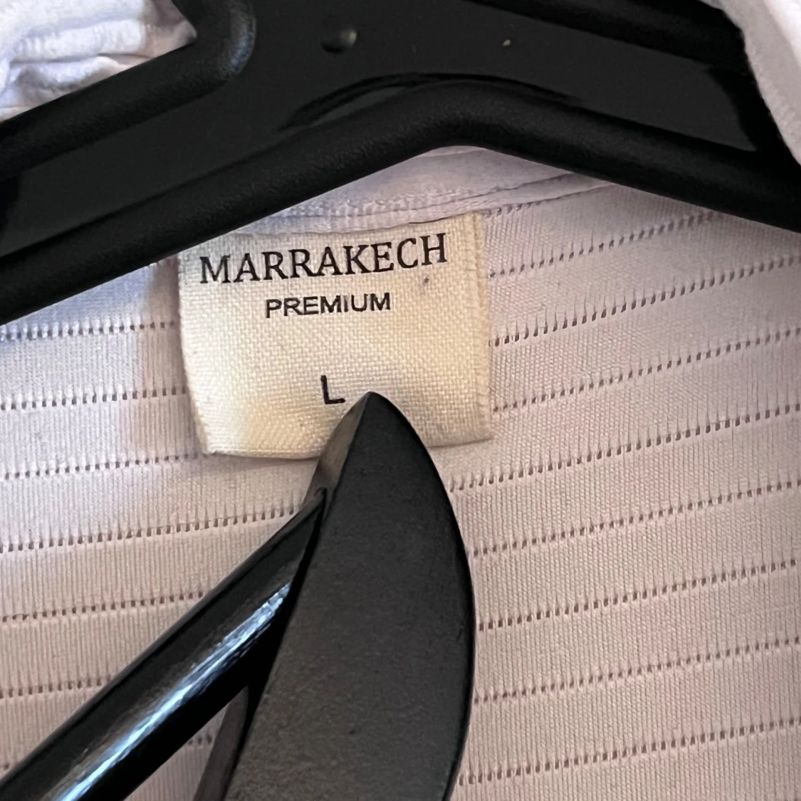 Säljer en vit skjorta från Marrakech i storlek L. Skjortan har korta ärmar, knappar framtill och ett bröstficka med snedställda ränder och en cool etikett. Materialet är bomull och har ett strukturerat randigt mönster som ger en unik look.
