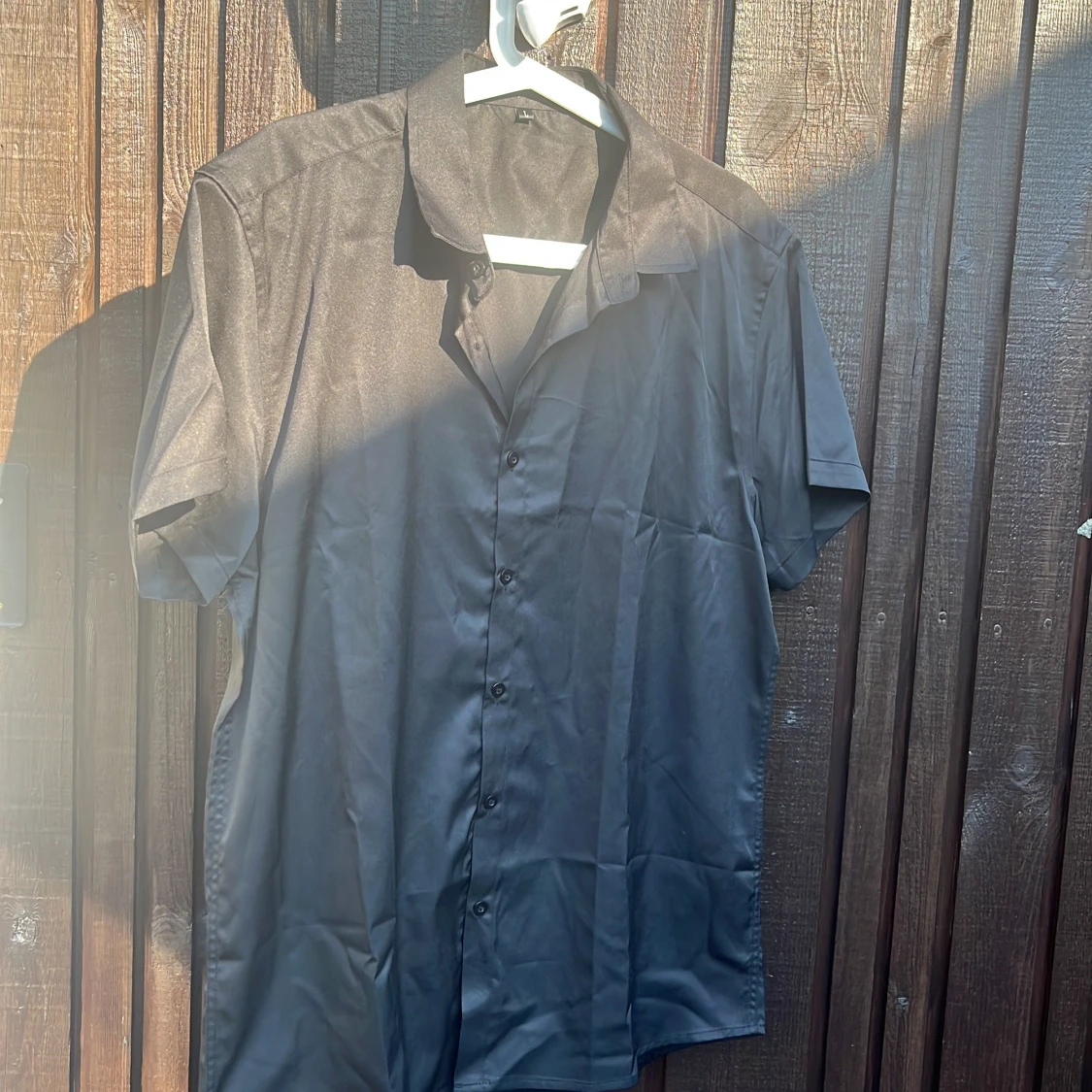 Stilren svart skjorta med korta ärmar och klassisk krage. Skjortan har knäppning framtill och är tillverkad i ett slätt, lätt material som ger en snygg och enkel look. Perfekt för dig som gillar minimalistisk stil.