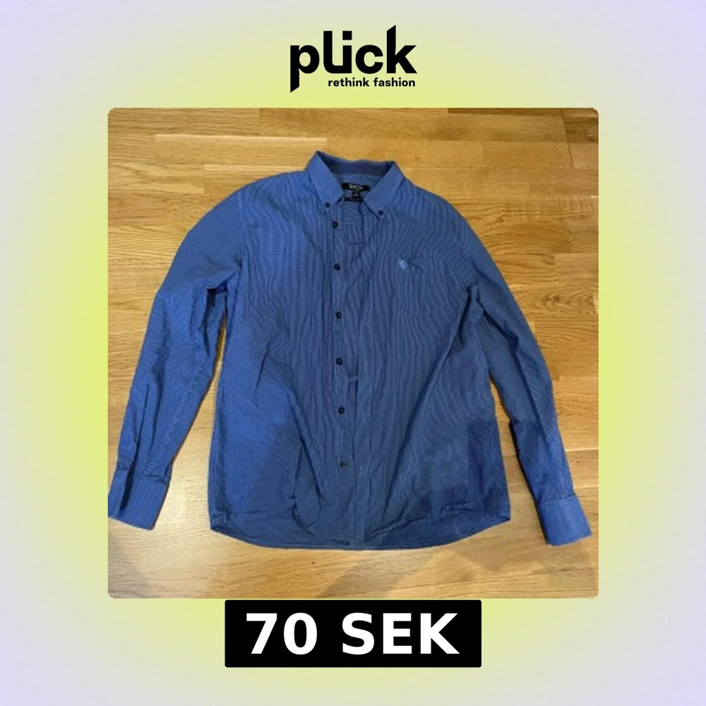 Snygg blå skjorta med tunna vita ränder och klassisk krage. Skjortan har svarta knappar, bröstficka med broderad logga och långa ärmar med manschett. Perfekt för dig som gillar stilren och enkel design.