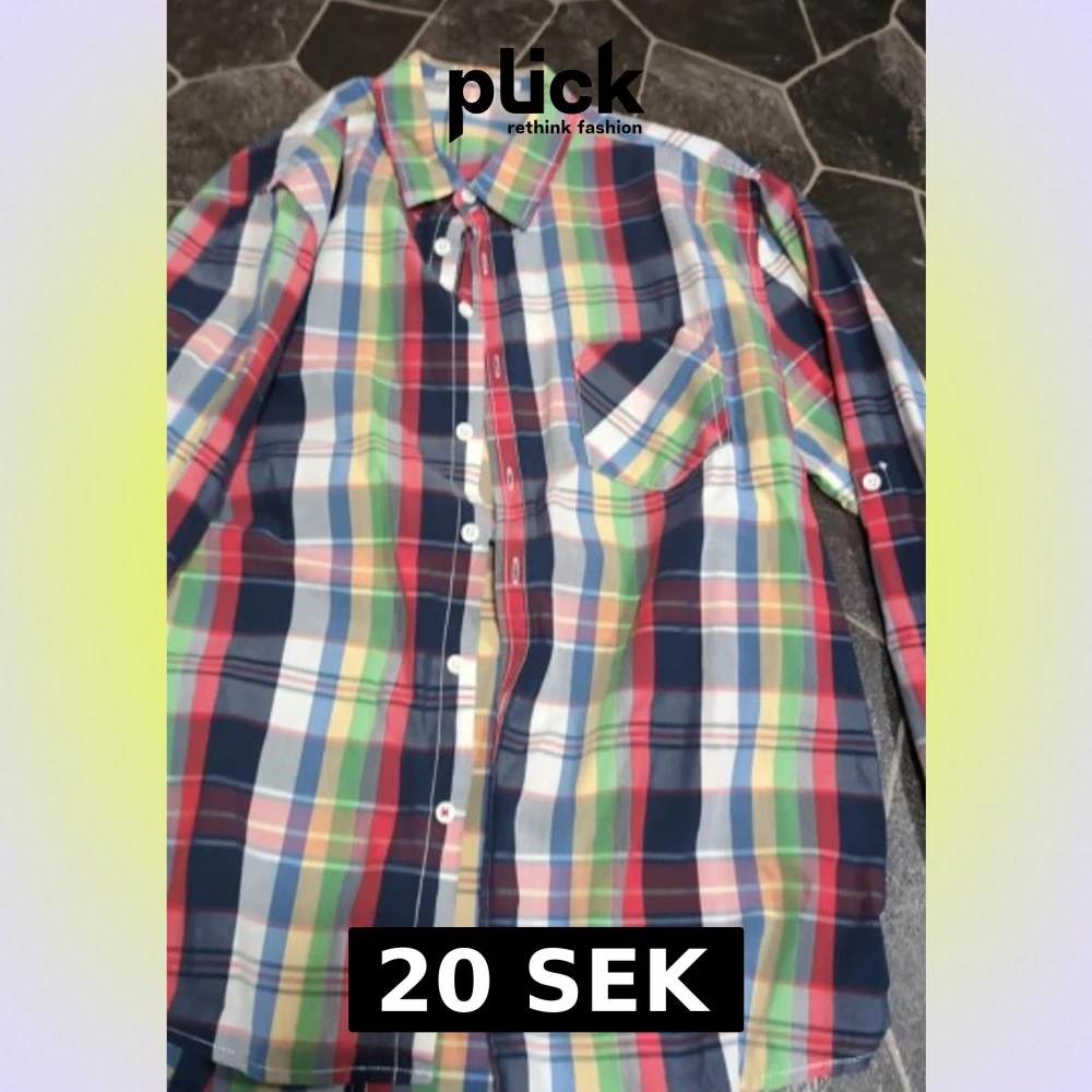 Säljer en riktigt färgglad skjorta med rutigt mönster i blått, rött, grönt, gult och vitt. Skjortan har klassisk krage, långärmade ärmar och vita knappar framtill. En bröstficka med samma rutiga mönster ger extra stilpoäng. Perfekt för dig som gillar att sticka ut.