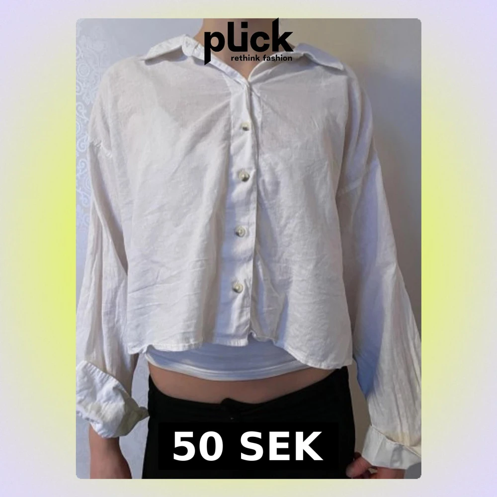 Säljer en vit croppad skjorta med långa ärmar från Gina tricot. Skjortan har en loose passform och är av linnen.