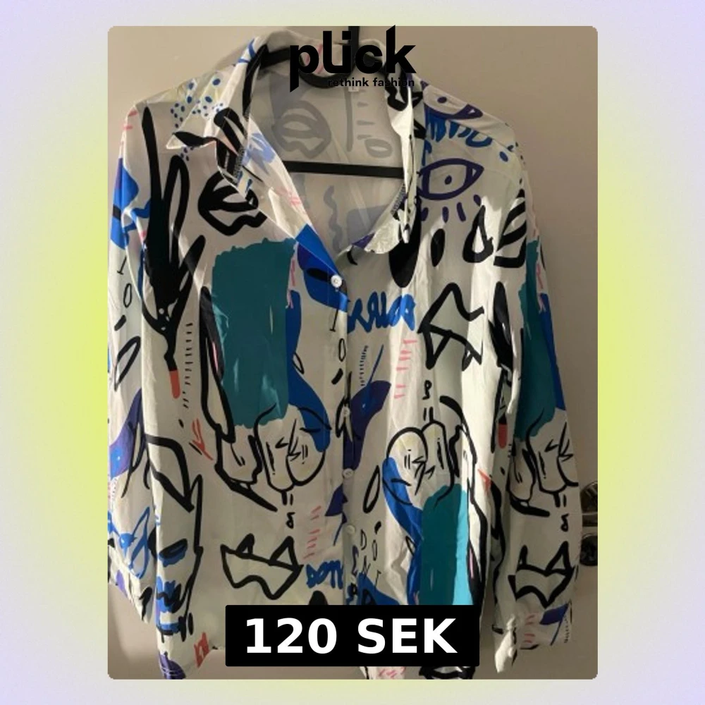 Säljer en vit skjorta i storlek L med ett riktigt coolt grafiskt mönster i blått, svart, rosa och turkost. Skjortan har långa ärmar och knappar framtill. Materialet känns lätt och skönt, perfekt för dig som gillar att sticka ut med färg och konstnärliga prints.