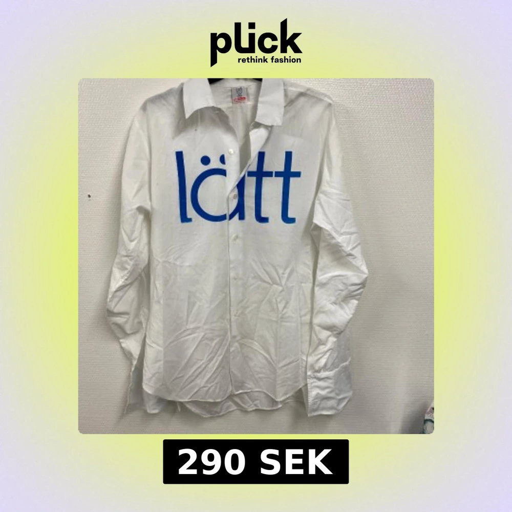 Säljer en vit skjorta med blå text 'lätt' tryckt på framsidan. Skjortan har långa ärmar och knappar framtill. Perfekt för en avslappnad stil.
