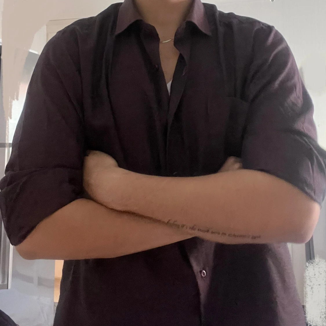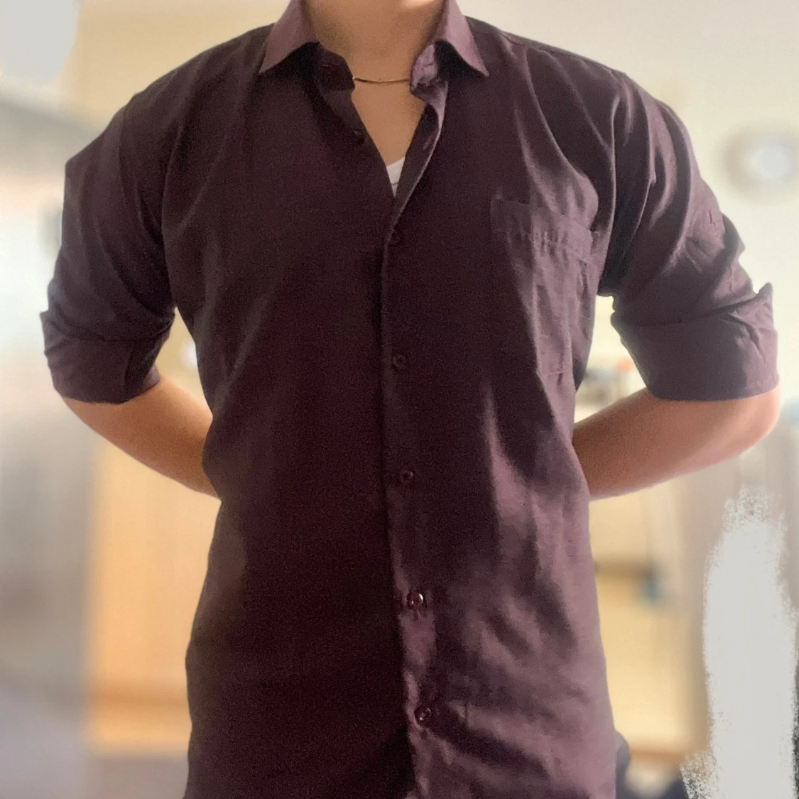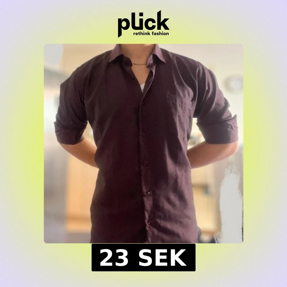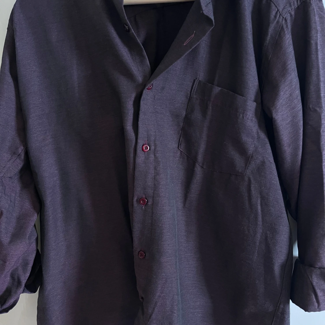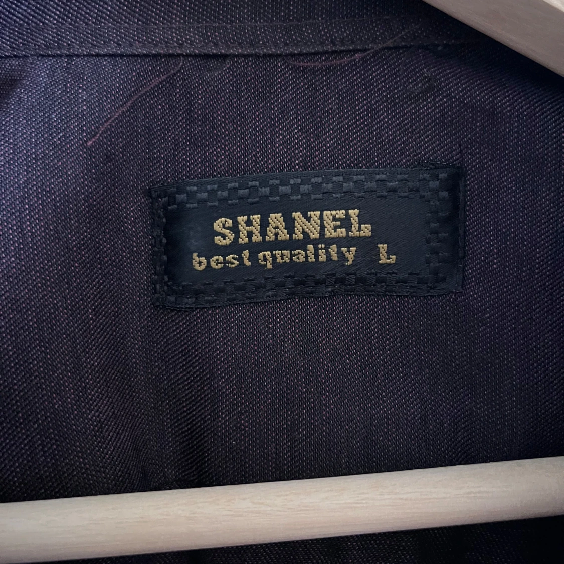 Snygg mörklila skjorta från Shanel i storlek L. Skjortan har klassisk krage, bröstficka och matchande knappar framtill. Materialet känns som bomull och passformen är normal. Perfekt för dig som gillar stilrena plagg med enkel design.