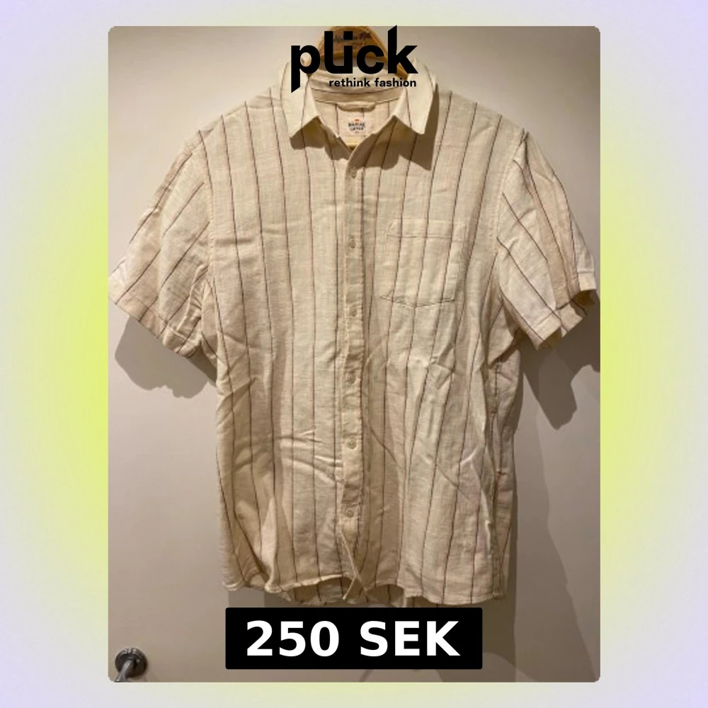 Säljer en beige kortärmad skjorta från H&M med tunna vertikala ränder i rött och blått. Storleken står M/L men passar mer som L.