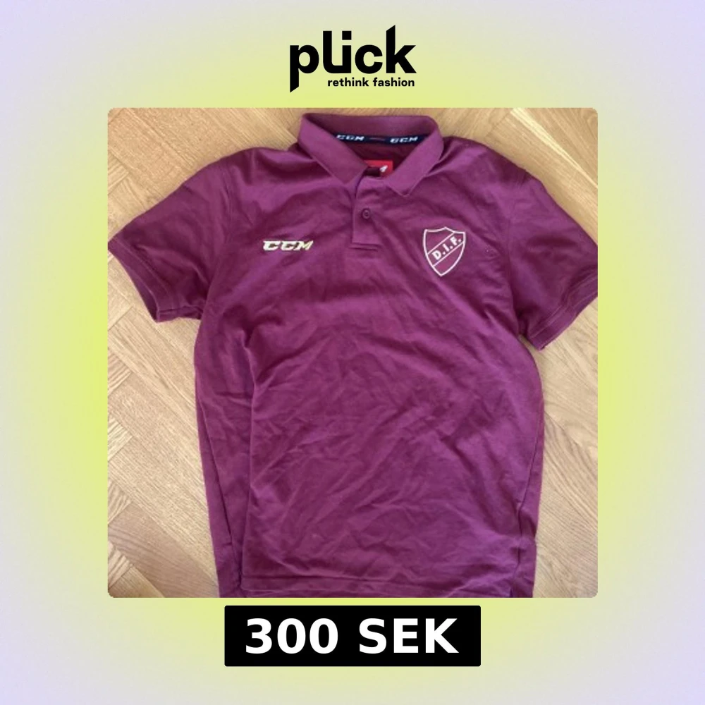 Säljer en vinröd pikétröja från CCM med DIF-logga på bröstet. Tröjan har klassisk krage, korta ärmar och knappar vid halsen. Perfekt för dig som vill visa ditt stöd för Djurgården med stil.