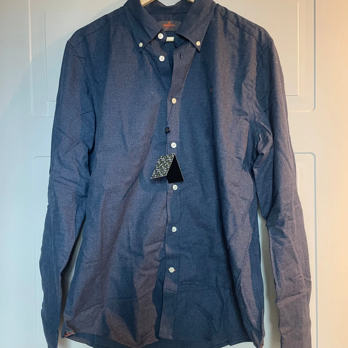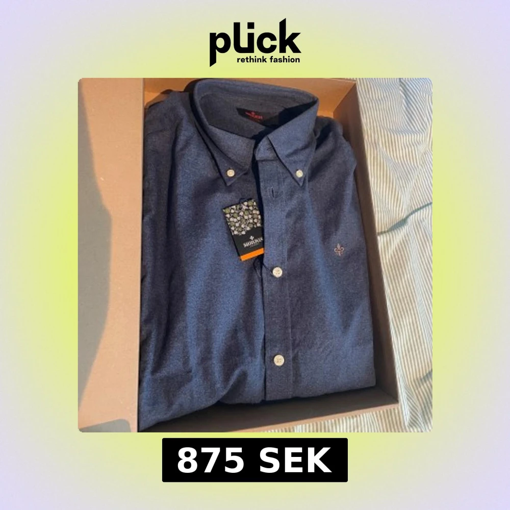 Snygg blå skjorta från Morris Stockholm med klassisk button down-krage och vita knappar. Skjortan har en broderad guldfärgad lilja på bröstet och är tillverkad i mjuk bomull. Perfekt för dig som gillar stilrena och tidlösa plagg. Prislapp sitter kvar ock skickas i original förpackning. Nypris 1499kr