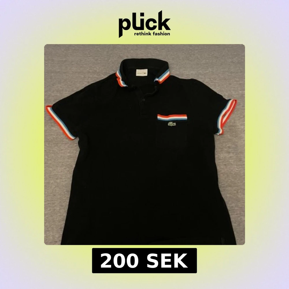 Svart pikétröja från Lacoste med korta ärmar och krage. Snygga ränder i orange, vit och blå på ärmslut, krage och bröstficka. Klassisk Lacoste-logga på fickan. Tröjan är gjord i mjuk bomull och har en normal passform.