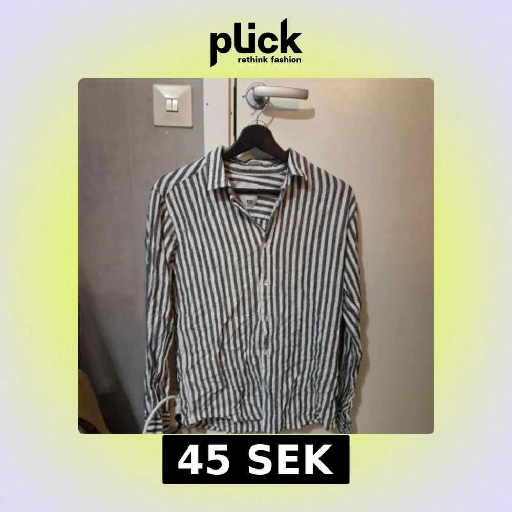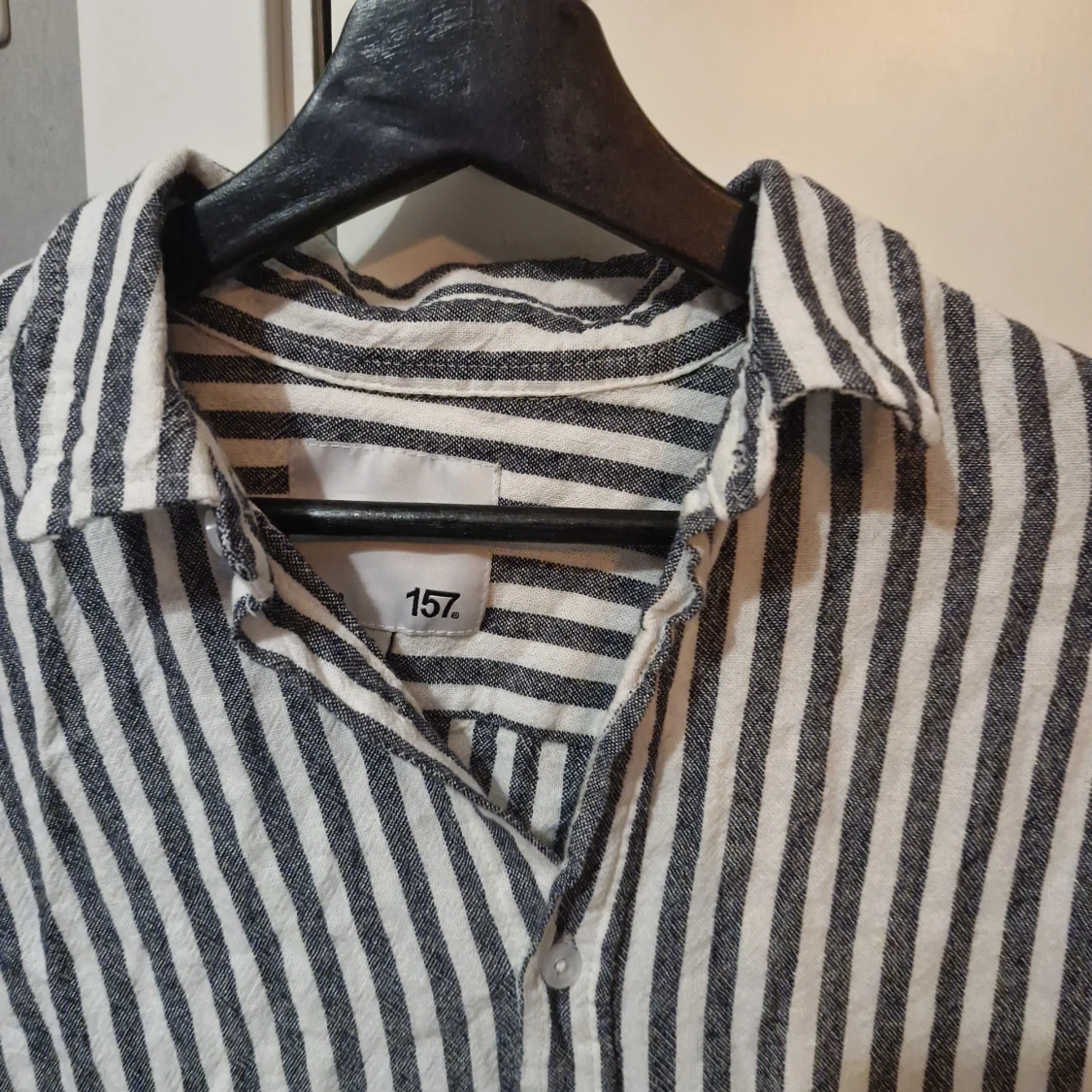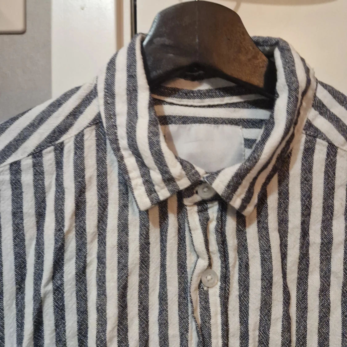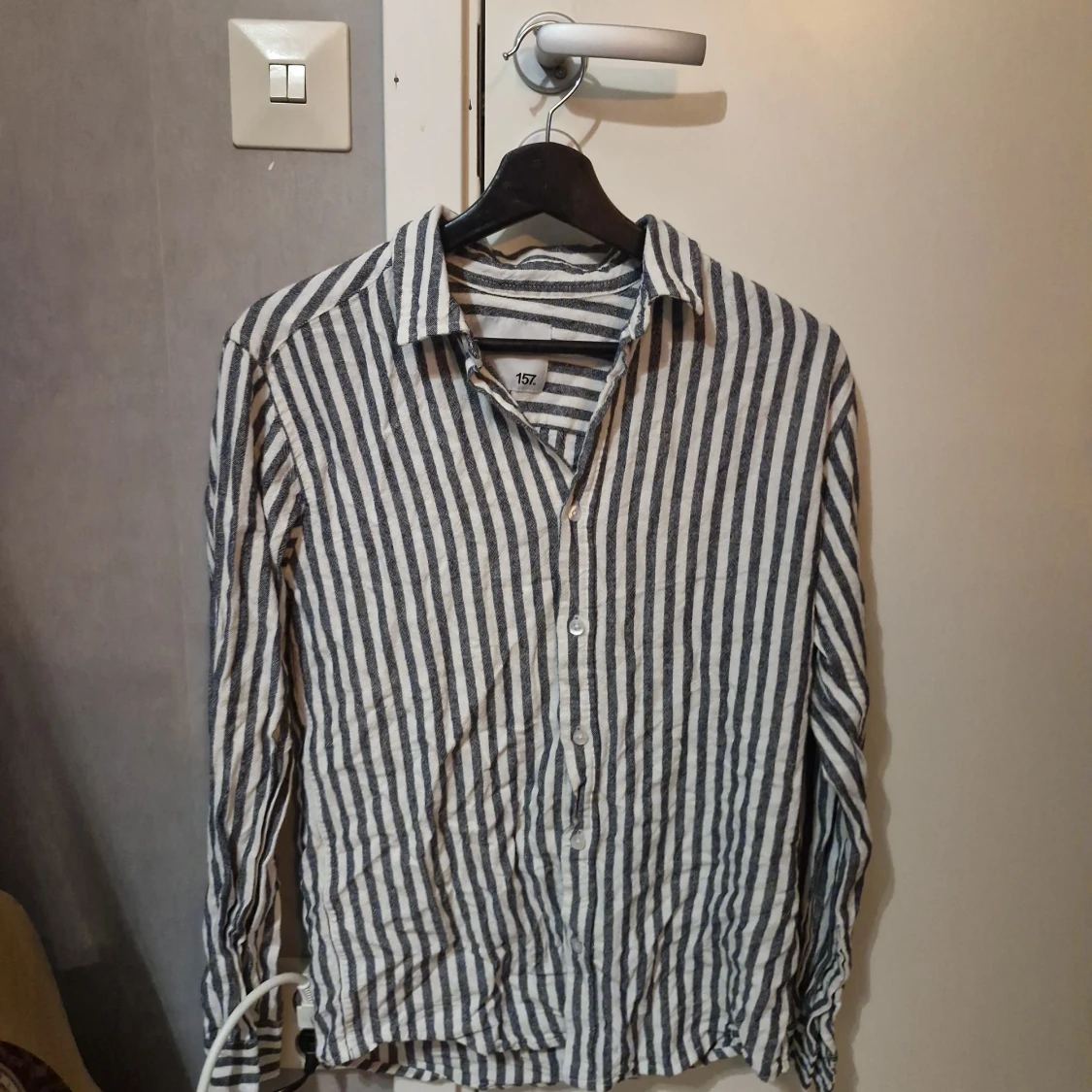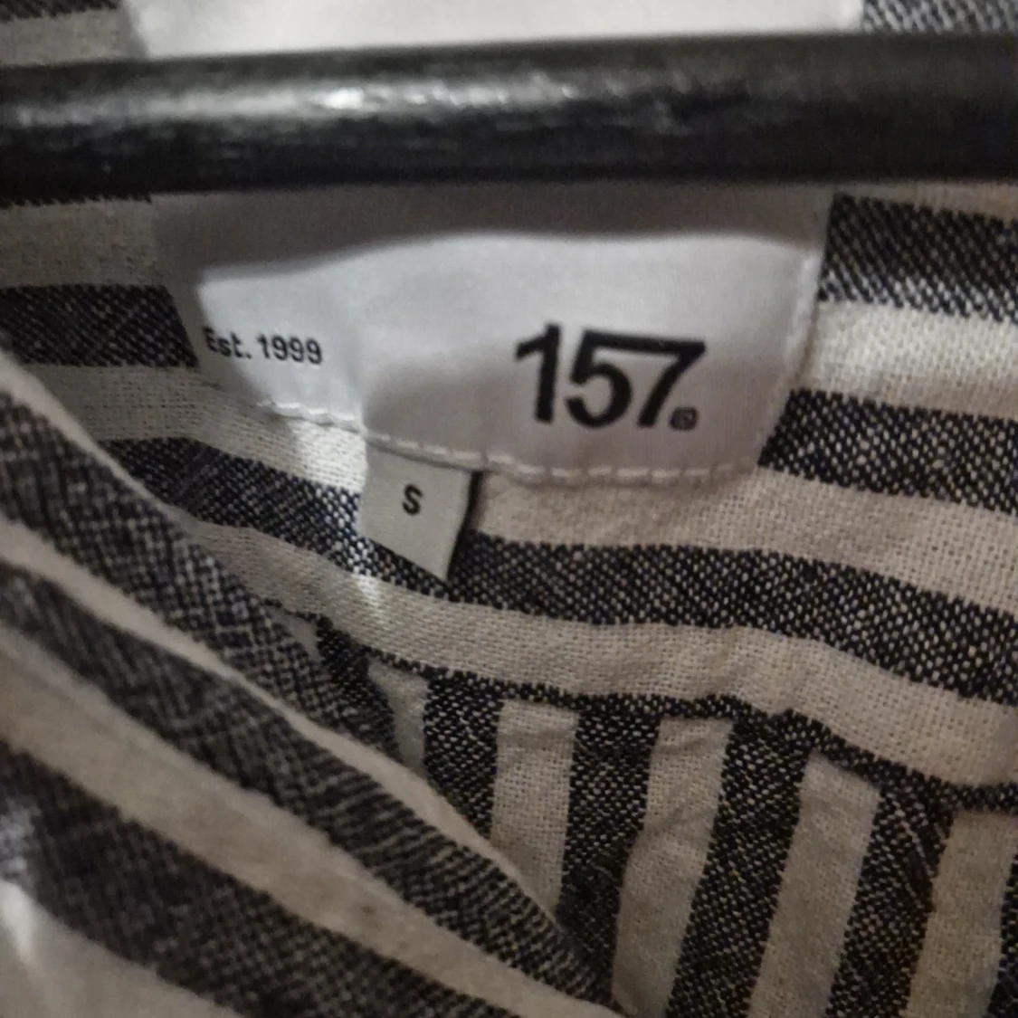 Snygg skjorta från 157 i storlek S med svartvita vertikala ränder. Skjortan har klassisk krage, knäppning framtill och långa ärmar. Tillverkad i ett mjukt bomullstyg som känns skönt mot huden. Perfekt för dig som gillar en stilren och avslappnad look.