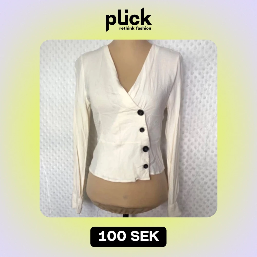 Säljer en stilren vit omlottblus med snygga svarta knappar. Blusen har en v-ringad design och långa ärmar, perfekt för både vardag och fest. Materialet känns mjukt och bekvämt mot huden. Passar bra till både jeans och kjol!