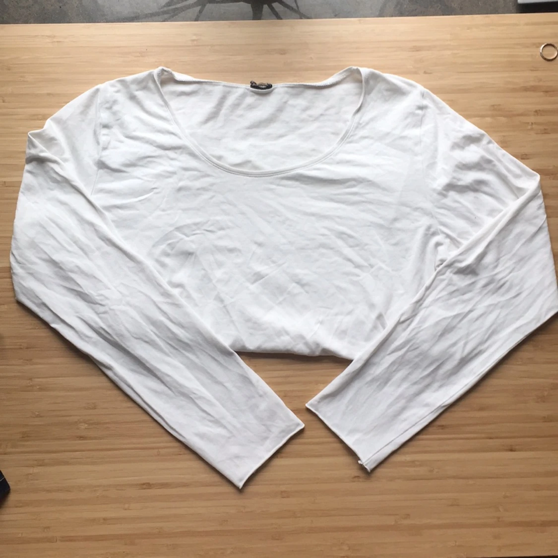 Långärmad tröja i stretchigt material. Avklippt i ärmar och längst ner vilket ger fint rullade kanter