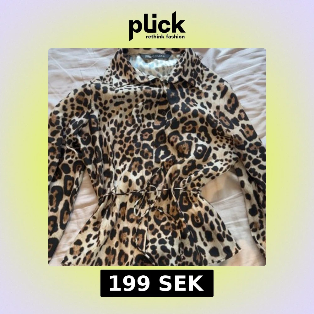 Snygg långärmad skjorta från Zara med leopardmönster. Skjortan har klassisk krage, knappar framtill och ett smalt knytband i midjan för extra stilpoäng.