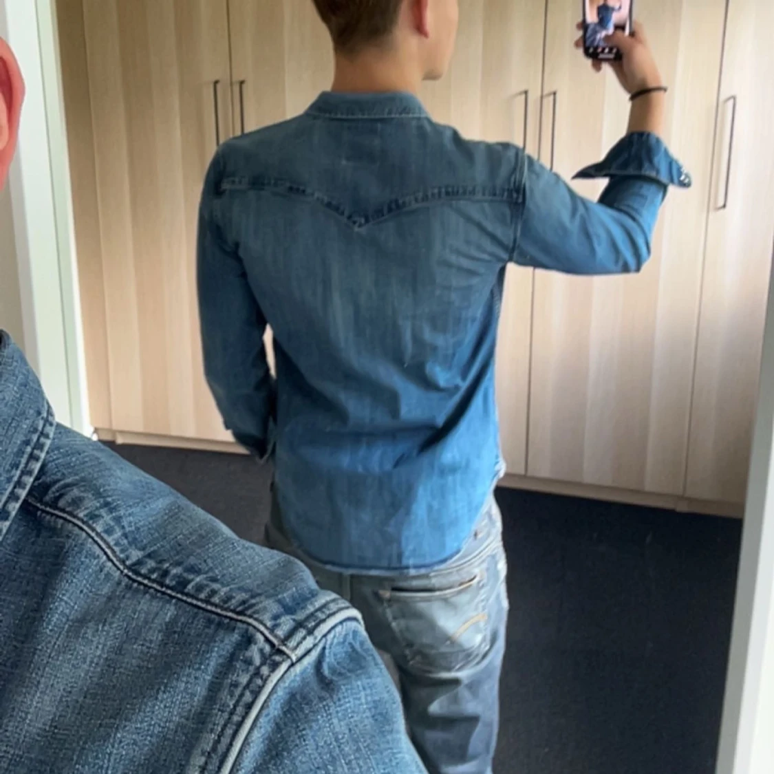 Säljer en vinted blå jeansskjorta från Levi's med långa ärmar och tryckknappar och en snygg western-inspirerad söm på ryggen.