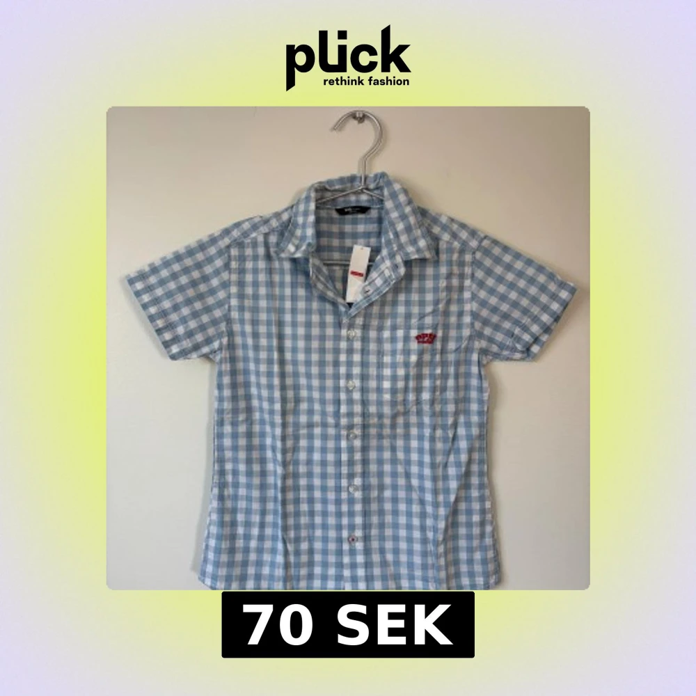 Kortärmad skjorta från i ljusblått och vitt rutigt mönster. Klassisk krage, knäppning framtill och liten bröstficka med röd brodyr. Skjortan är i tunn bomull,