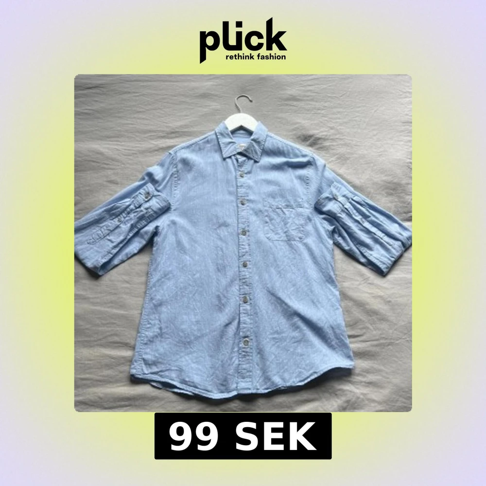 Säljer en ljusblå jeansskjorta med knappar framtill. Perfekt för en avslappnad och cool stil.