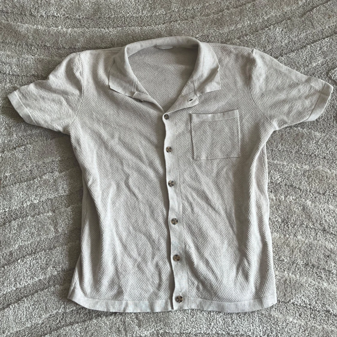 Snygg ljusbeige skjorta med korta ärmar och klassisk krage. Skjortan har knappar framtill och en bröstficka. Materialet är mjukt och har ett diskret mönster som ger en stilren känsla. Perfekt för en chill och avslappnad look.