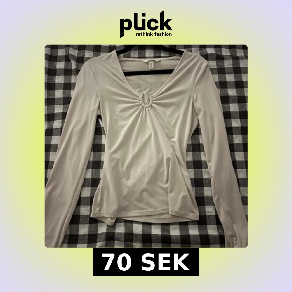 Snygg ljusbeige långärmad topp från H&M med v-ringning och cool rynkad detalj med ring framtill. Mjuk och stretchig polyester som sitter skönt och har en slim passform. Perfekt för dig som gillar stilrena och trendiga plagg.