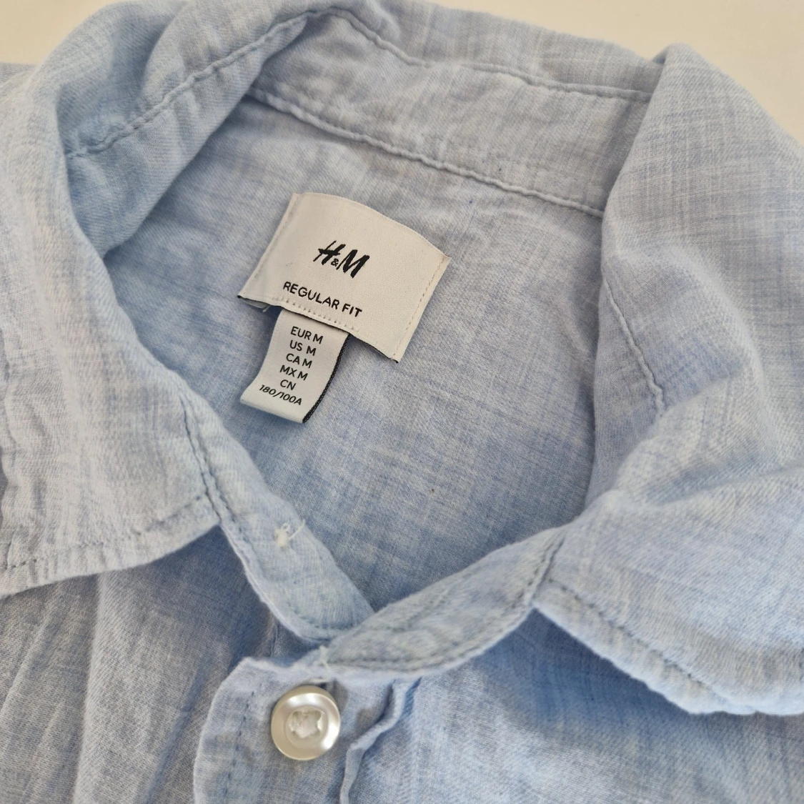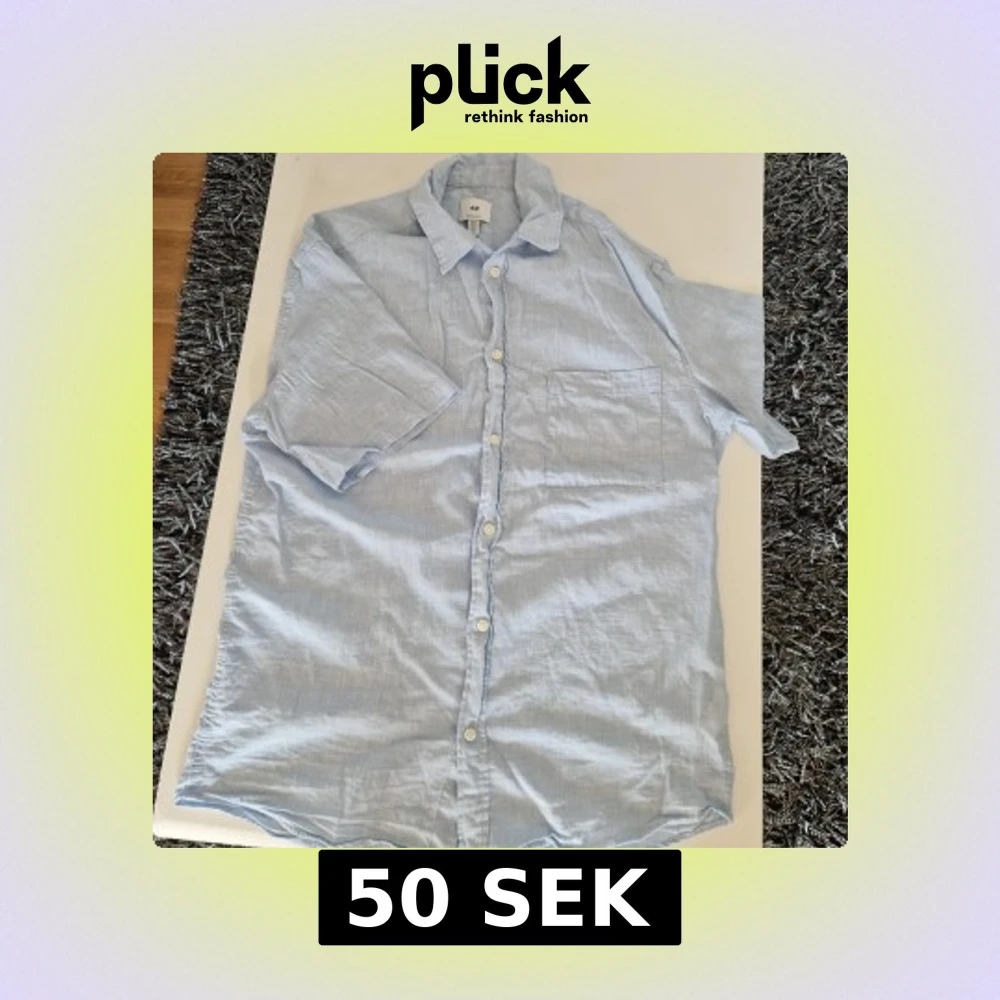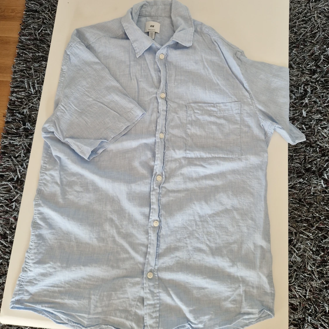 Säljer en ljusblå skjorta från H&M i regular fit. Skjortan är tillverkad i svalt linne, har korta ärmar, klassisk krage, bröstficka och knäppning framtill. Perfekt för varma dagar och enkel att styla med jeans eller shorts.