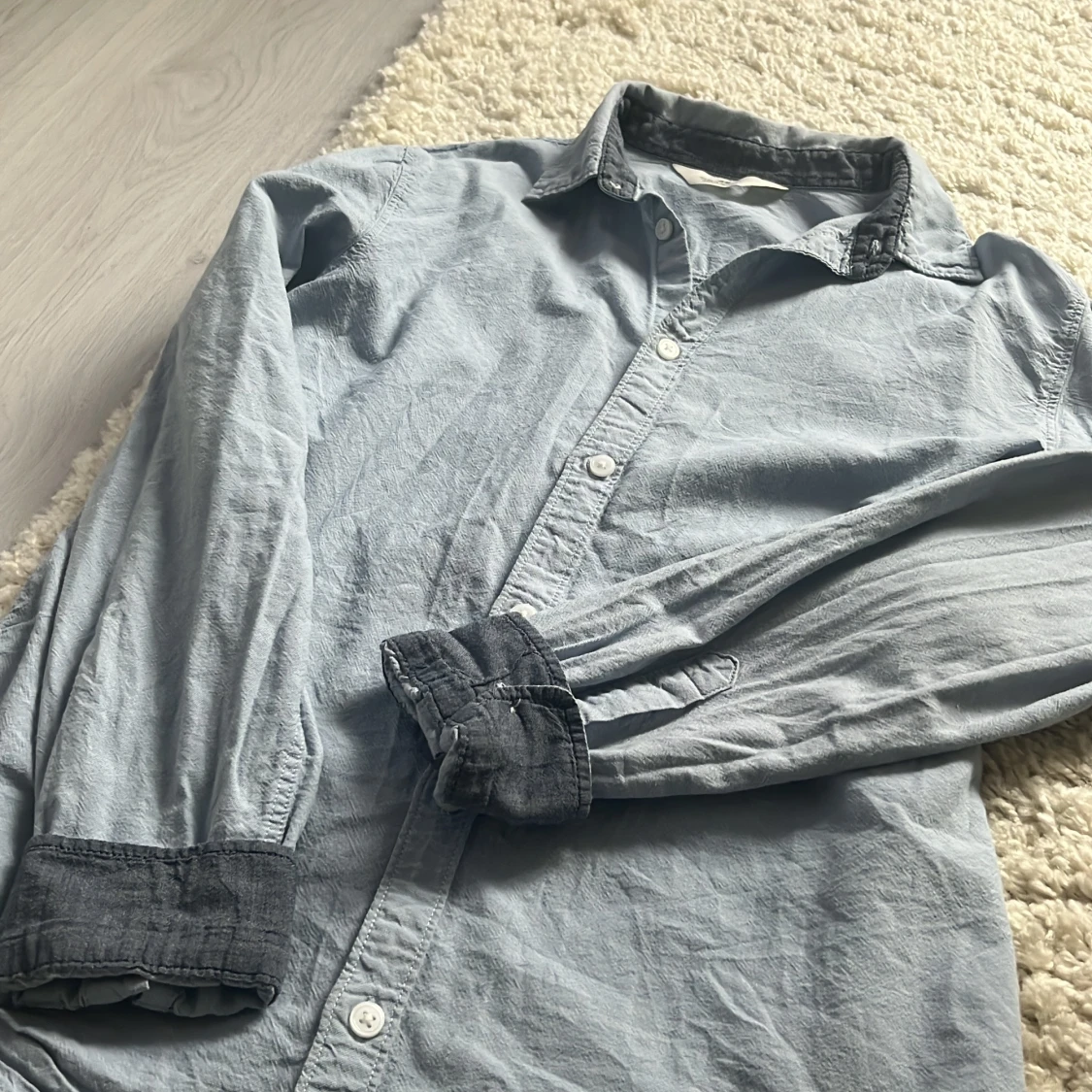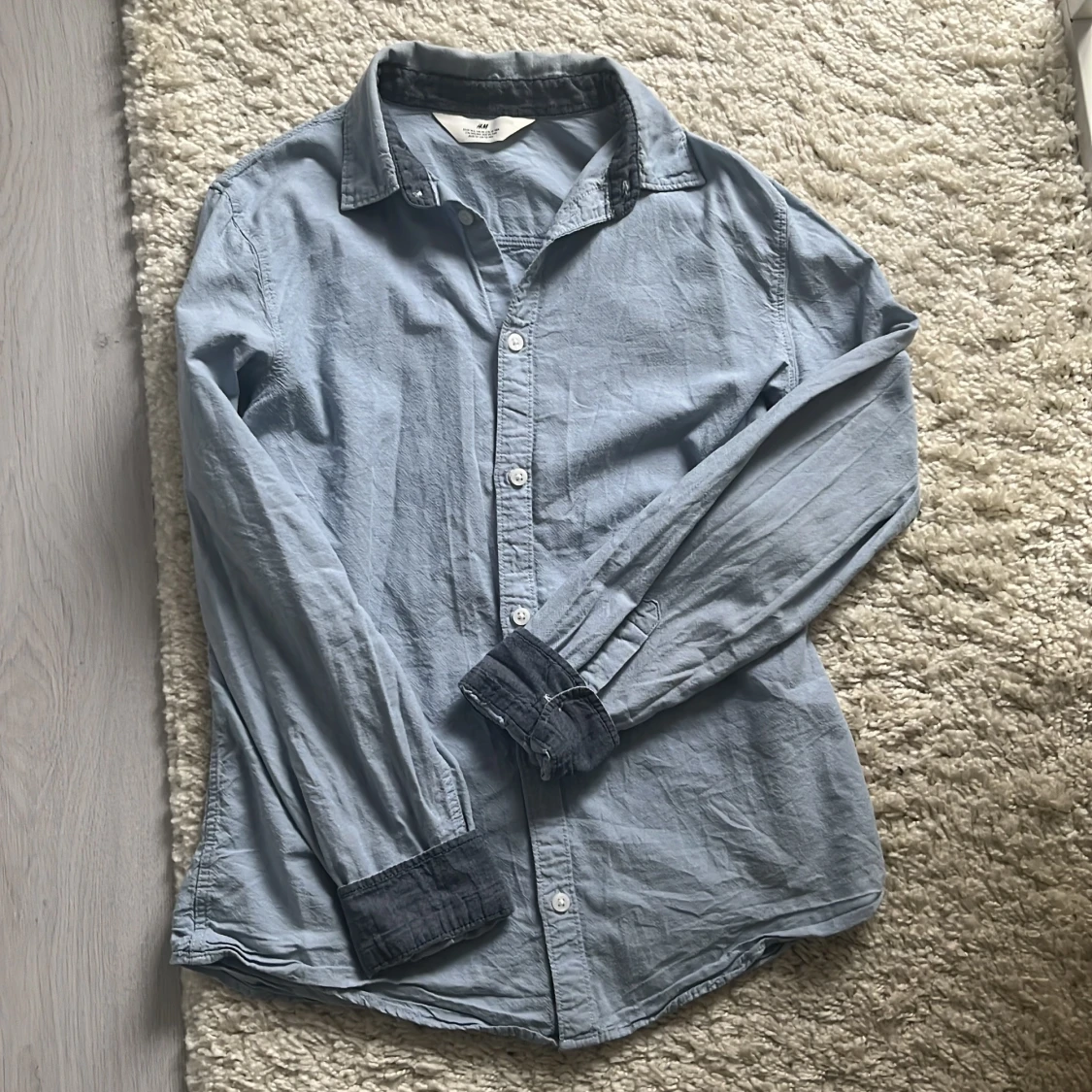 Ljusblå skjorta från H&M i storlek 164. Skjortan har klassisk krage, vita knappar och kontrastfärgade mörkblå detaljer på insidan av krage och ärmslut. Inte så jätte ny men inte använt den den har mest tagit plats. Passar om man 160-175 runt där. Bara skriva för mer bilder eller frågor.😊