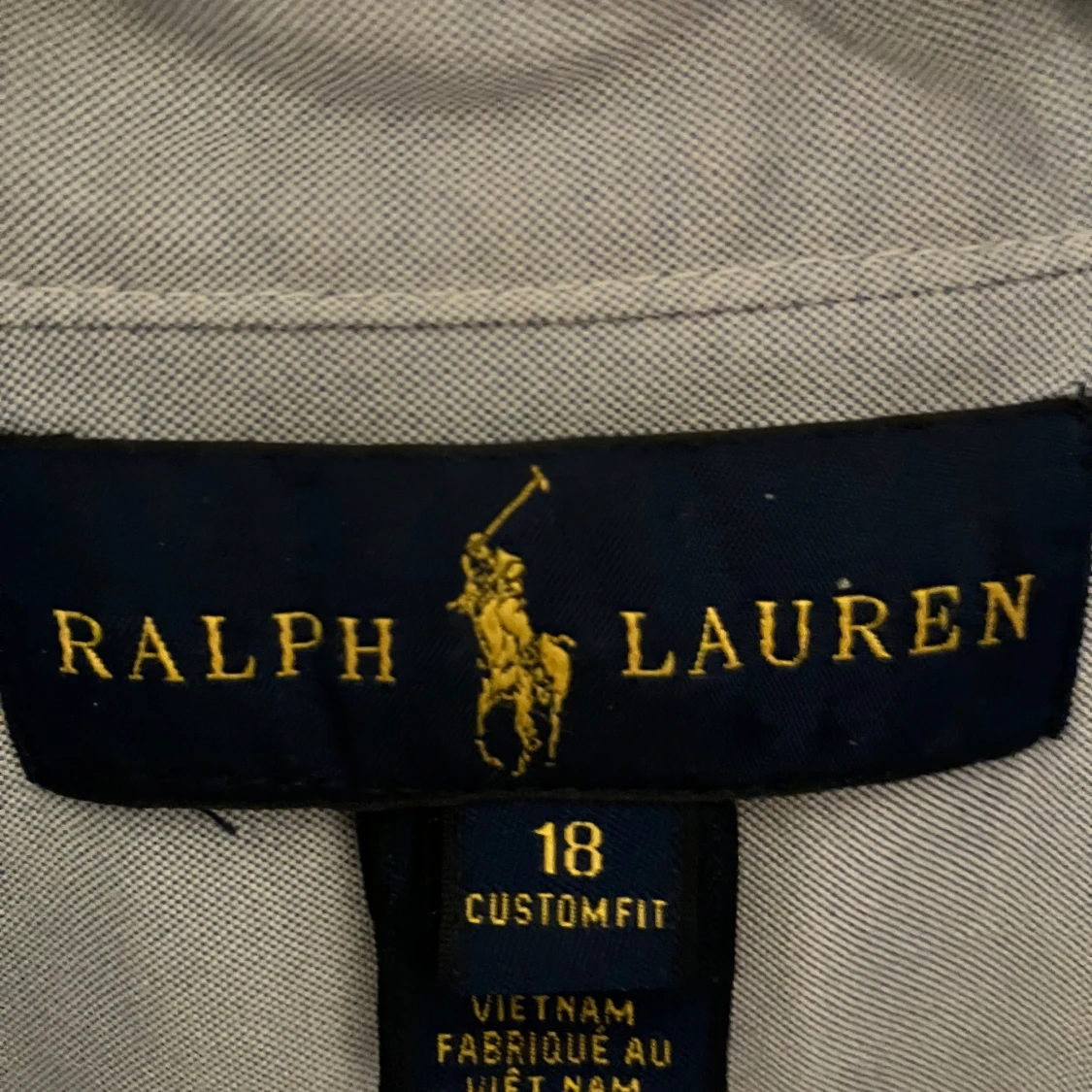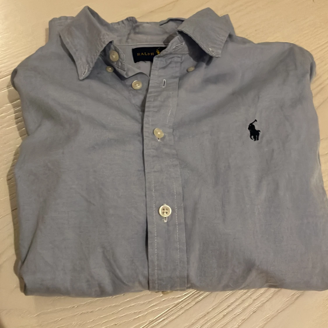 Klassisk ljusblå skjorta från Ralph Lauren med broderad marinblå logga på bröstet. Skjortan har lång ärm, knappar framtill och en snygg custom fit-passform. Perfekt för dig som gillar stilrena och tidlösa plagg. Skjortan är ljusblå, sista bilden visar färgen bäst! Storlek 18 motsvarar ca 163-168cm. Nypris ca 1190,-