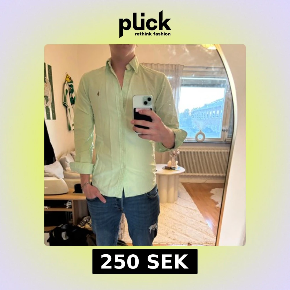 Fräsch ljusgrön skjorta från Polo Ralph Lauren i slim fit. Klassisk krage, långa ärmar och knappar hela vägen. Broderad logga på bröstet och tillverkad i mjuk bomull. OBS, lite solblekt på krage. Perfekt för dig som gillar stilrena och snygga plagg.