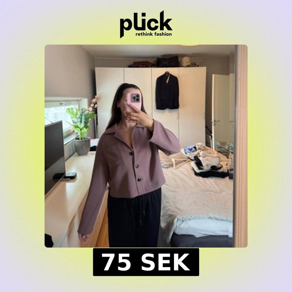 Säljer en ljuslila croppad kavaj med stora svarta knappar och klassisk krage. Jackan har lång ärm och en rak, oversize passform och väldigt elegant. Aldrig använd!