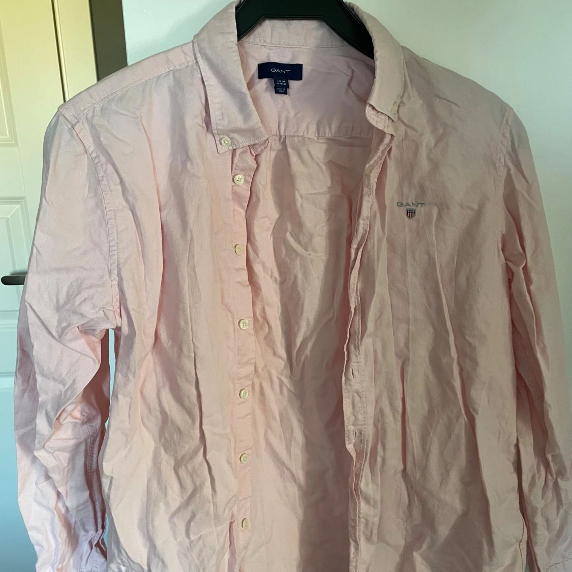 Säljer en stilren ljusrosa skjorta från Gant med klassisk krage och knäppning framtill. Skjortan har lång ärm och diskret Gant-logga broderad på bröstet. Perfekt för dig som gillar en clean och fräsch look.