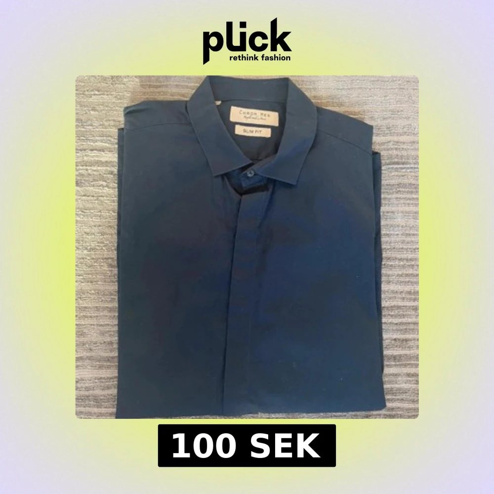 En marinblå skjorta i slim fit modell. På skjortan står det att det är storlek XL men jag skulle säga att den motsvarar mer en M storlek. Fin marinblå färg som inte är urtvättad. Axelmått 40 cm Längd 73 cm