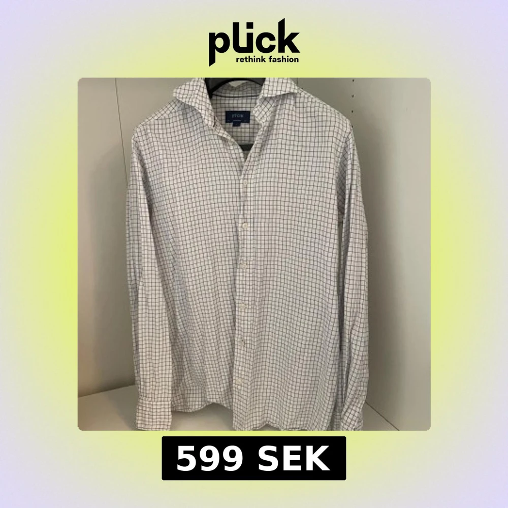 Knappt använd och nypris 1700kr. Vit skjorta från Eton i storlek M med blått rutmönster. Klassisk krage, långärmad och knäppning framtill. Skjortan är tillverkad i bomull och har en modern, stilren look som passar perfekt till jeans eller chinos.