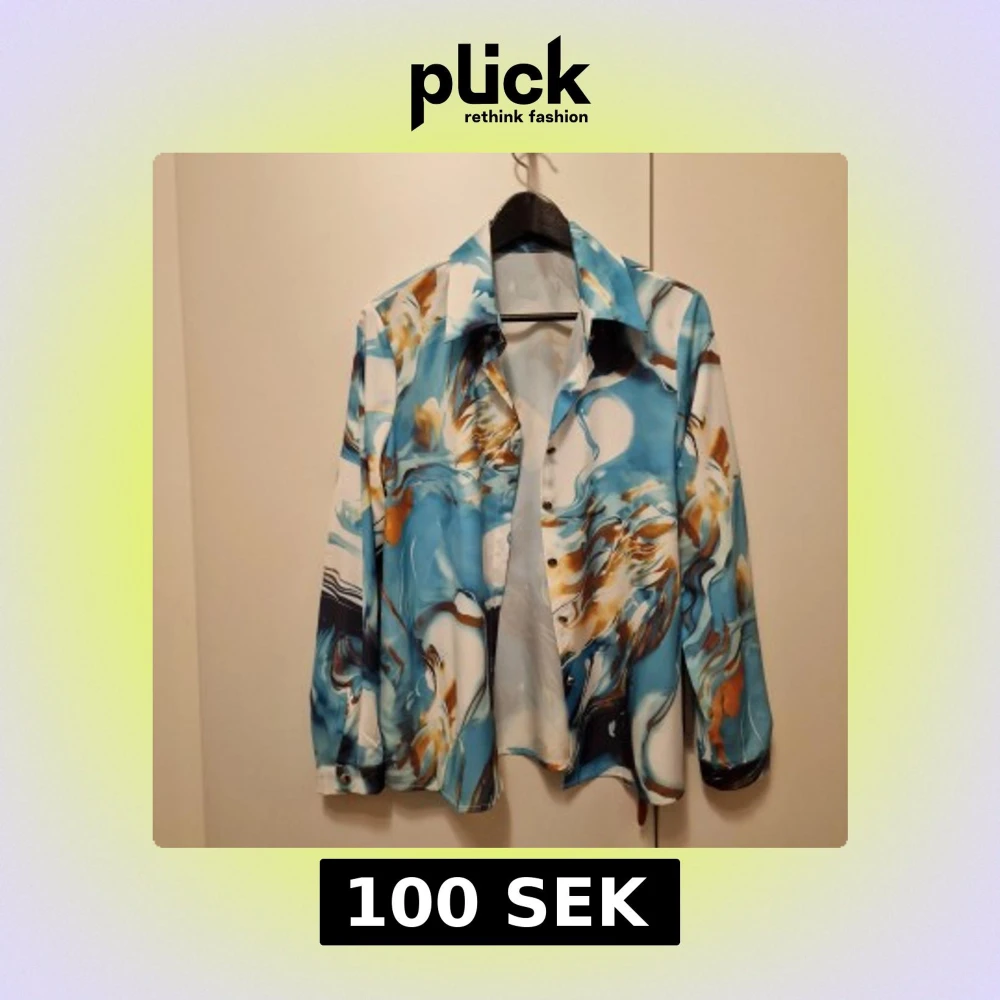 Snygg skjorta med abstrakt mönster i blå, vit och brun. Skjortan har långa ärmar och knappar framtill. Perfekt för en unik och stilren look.