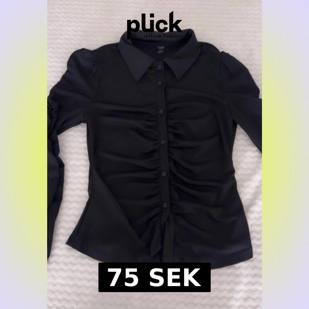 Svart skjorta från SHEIN i storlek M med snygga rynkdetaljer längs knappraden framtill. Skjortan har klassisk krage, långa ärmar och en figurnära passform. Materialet känns mjukt och lätt, perfekt för dig som gillar stilrena plagg med en twist.