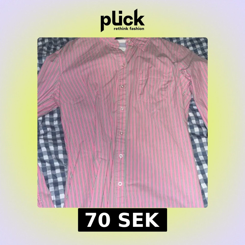 Säljer en klassisk rosa skjorta från Brooks Brothers men köpt på h&m , med tunna gröna och vita ränder. Skjortan har lång ärm, bröstficka och knäppning framtill. Perfekt för dig som gillar färg och vill sticka ut lite extra.