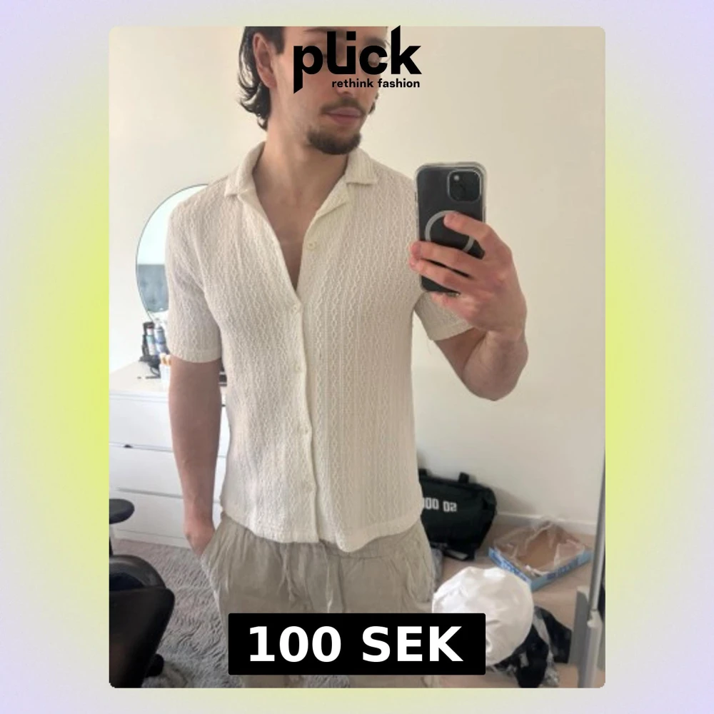 Säljer en vit skjorta med korta ärmar och diskret mönster. Skjortan har knappar framtill och en avslappnad krage. Perfekt för dig som gillar en clean och stilren look med lite extra detalj i tyget.