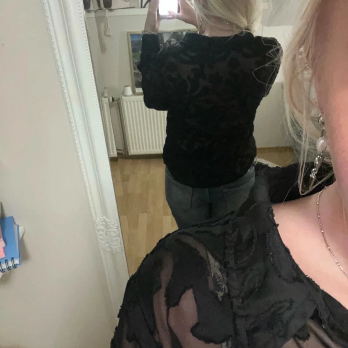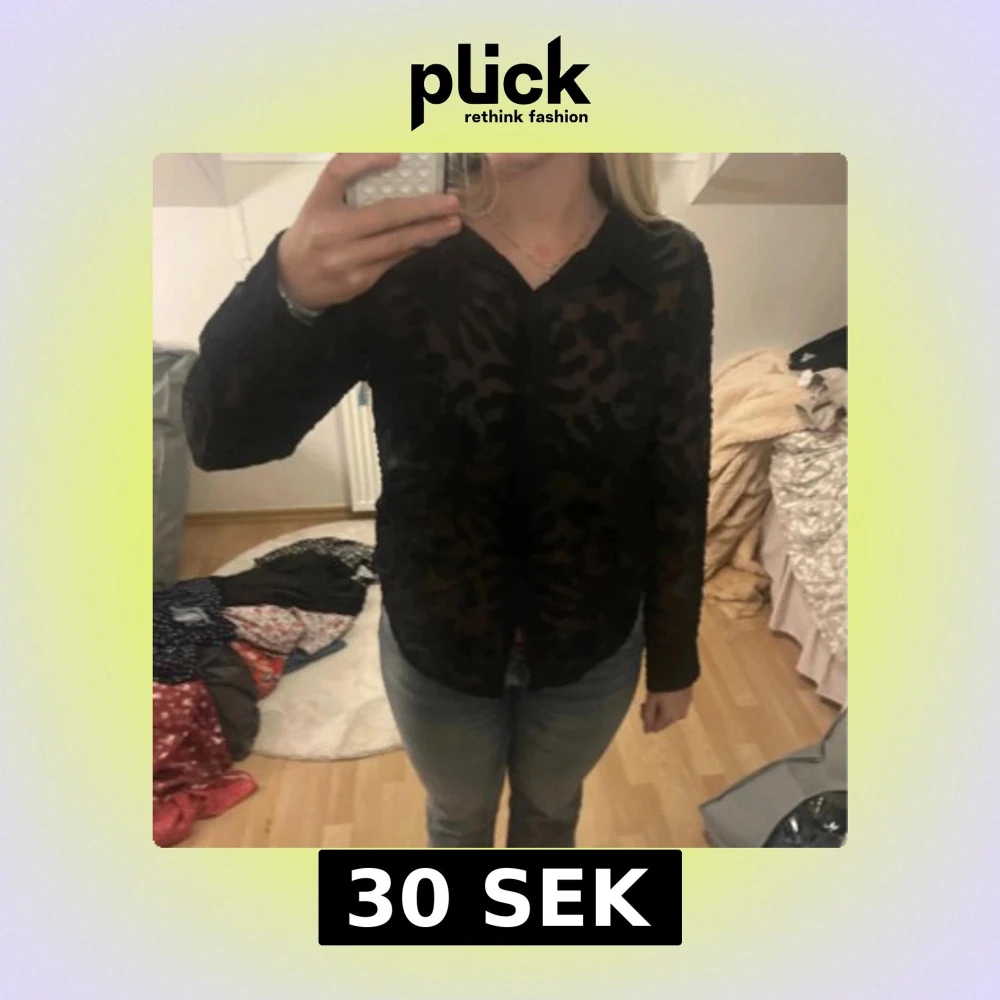Säljer en transparent svart skjorta med coolt mönster. Skjortan har krage och långa ärmar, perfekt för dig som vill sticka ut lite extra. Snygg att styla med jeans eller kjol för en trendig look.