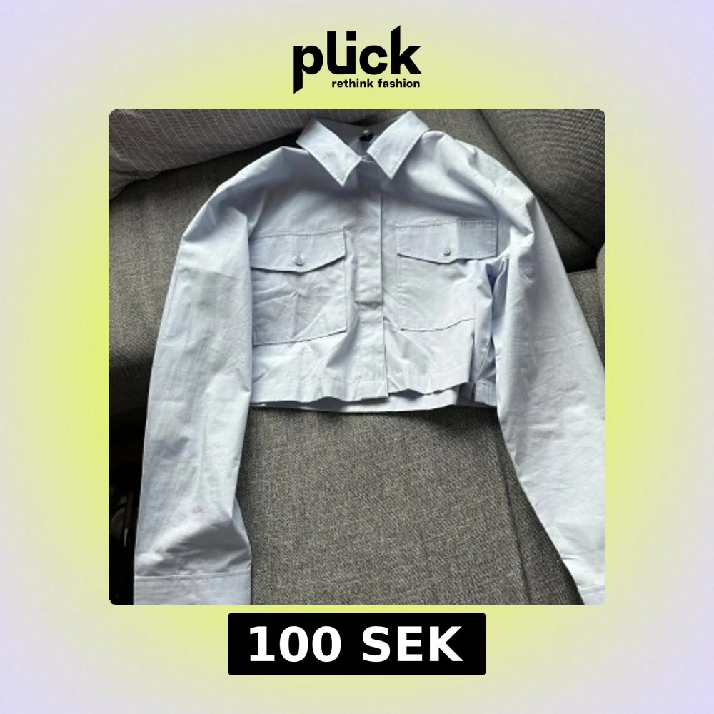 Säljer en stilren ljusblå croppad skjorta från H&M Divided. Skjortan har långa ärmar och två bröstfickor med knappar. Perfekt för en trendig look!