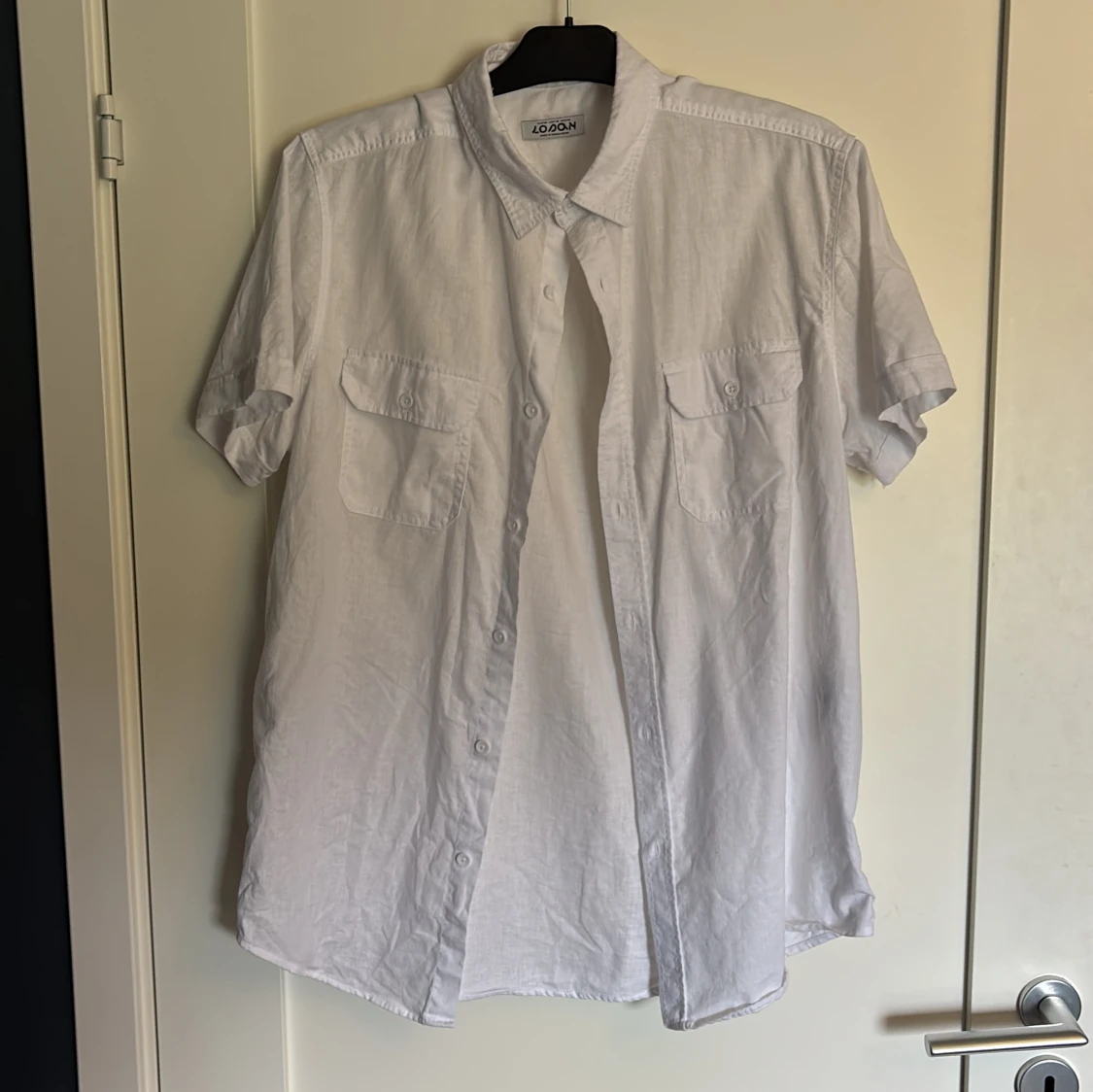 Vit skjorta från Lodon i luftig bomull, perfekt för varma dagar. Klassisk krage, korta ärmar och två bröstfickor med knappar. Rak passform och knäppning framtill. Enkel och stilren design som funkar till många olika looks.
