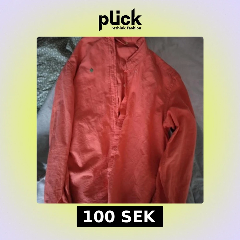 Säljer en korallröd henley-skjorta med lång ärm och ståkrage. Skjortan har en liten grön broderad detalj på bröstet och är tillverkad i ett mjukt bomullstyg. Perfekt för dig som gillar en avslappnad men ändå stilren look.
